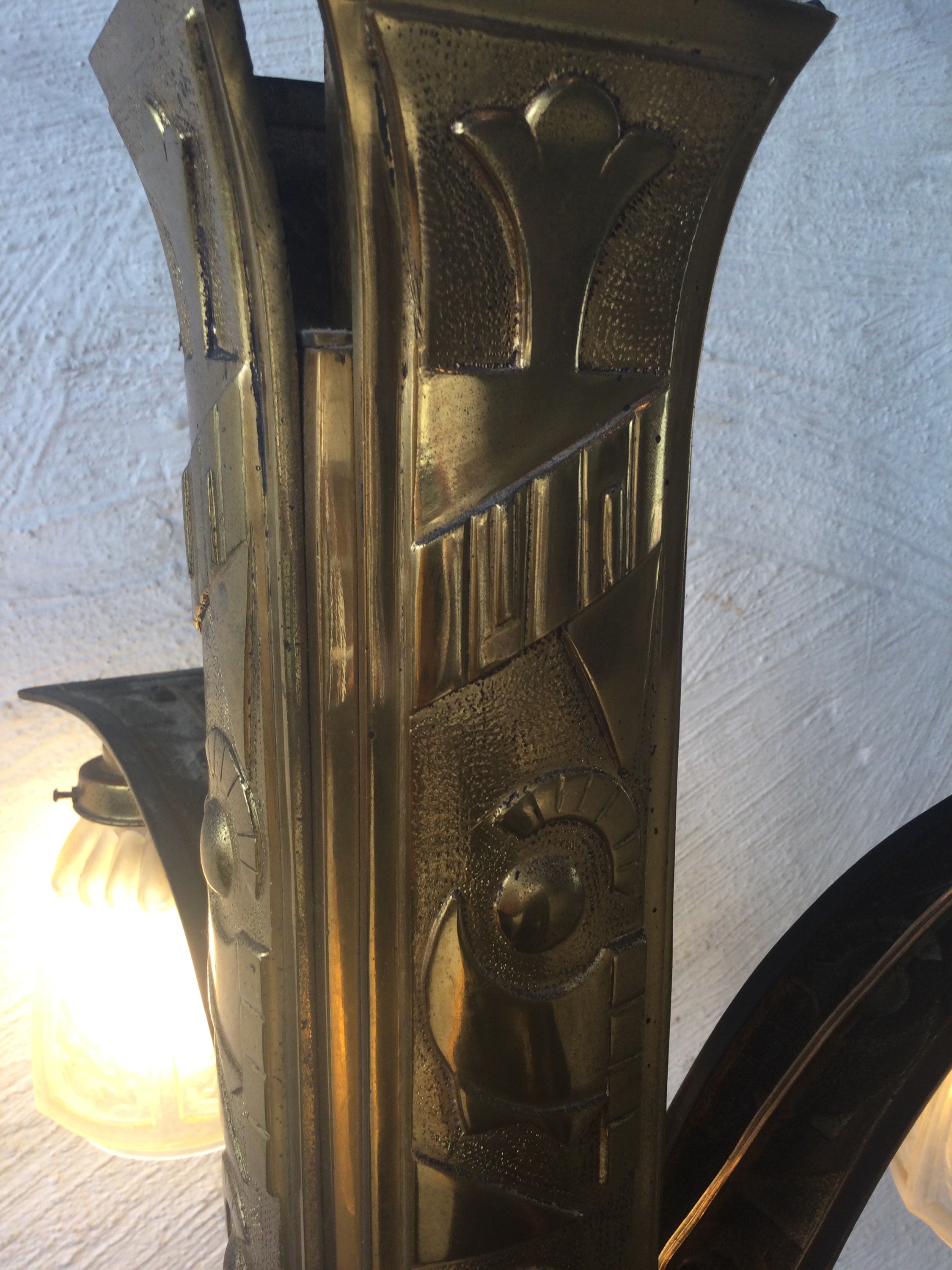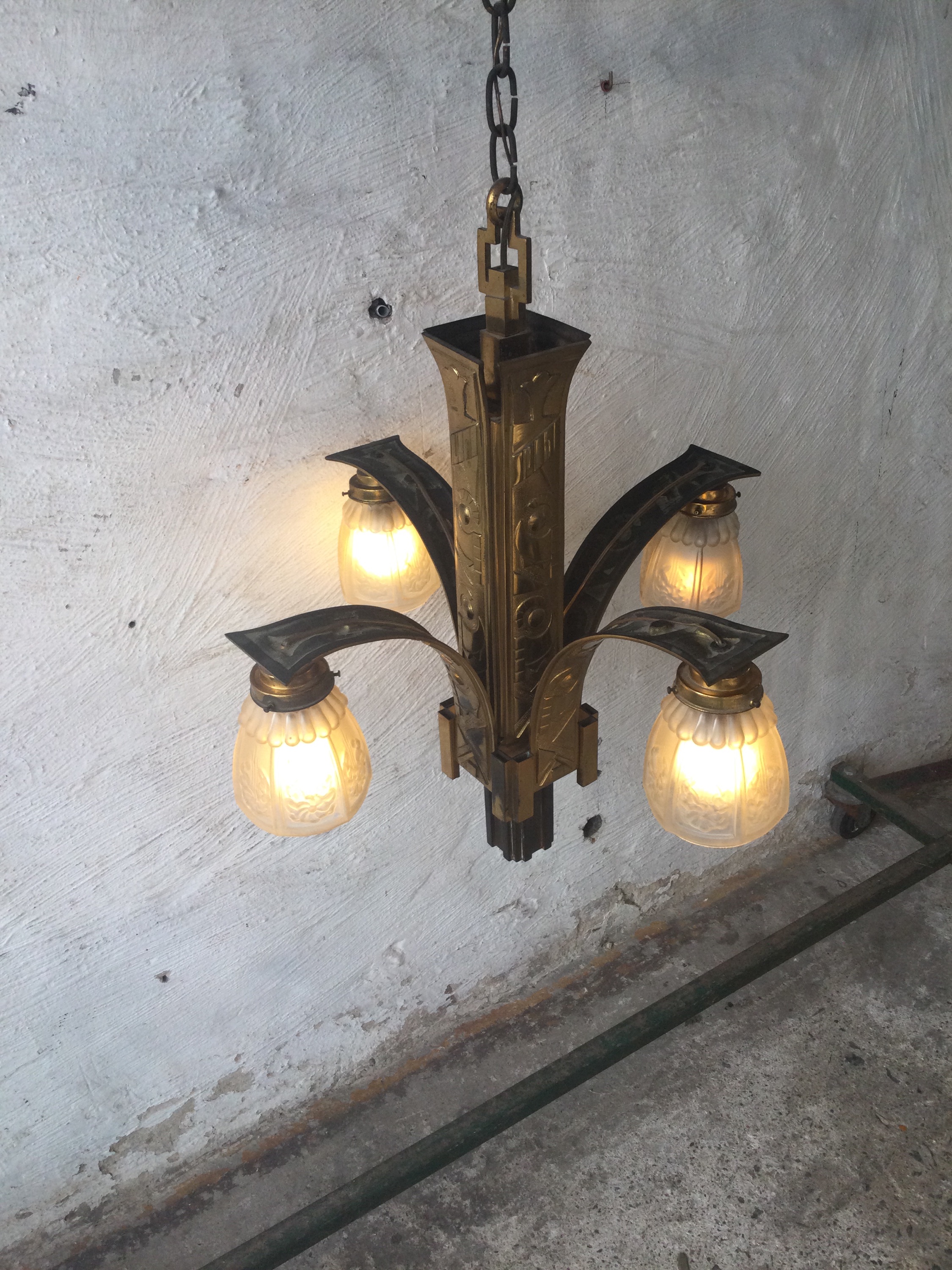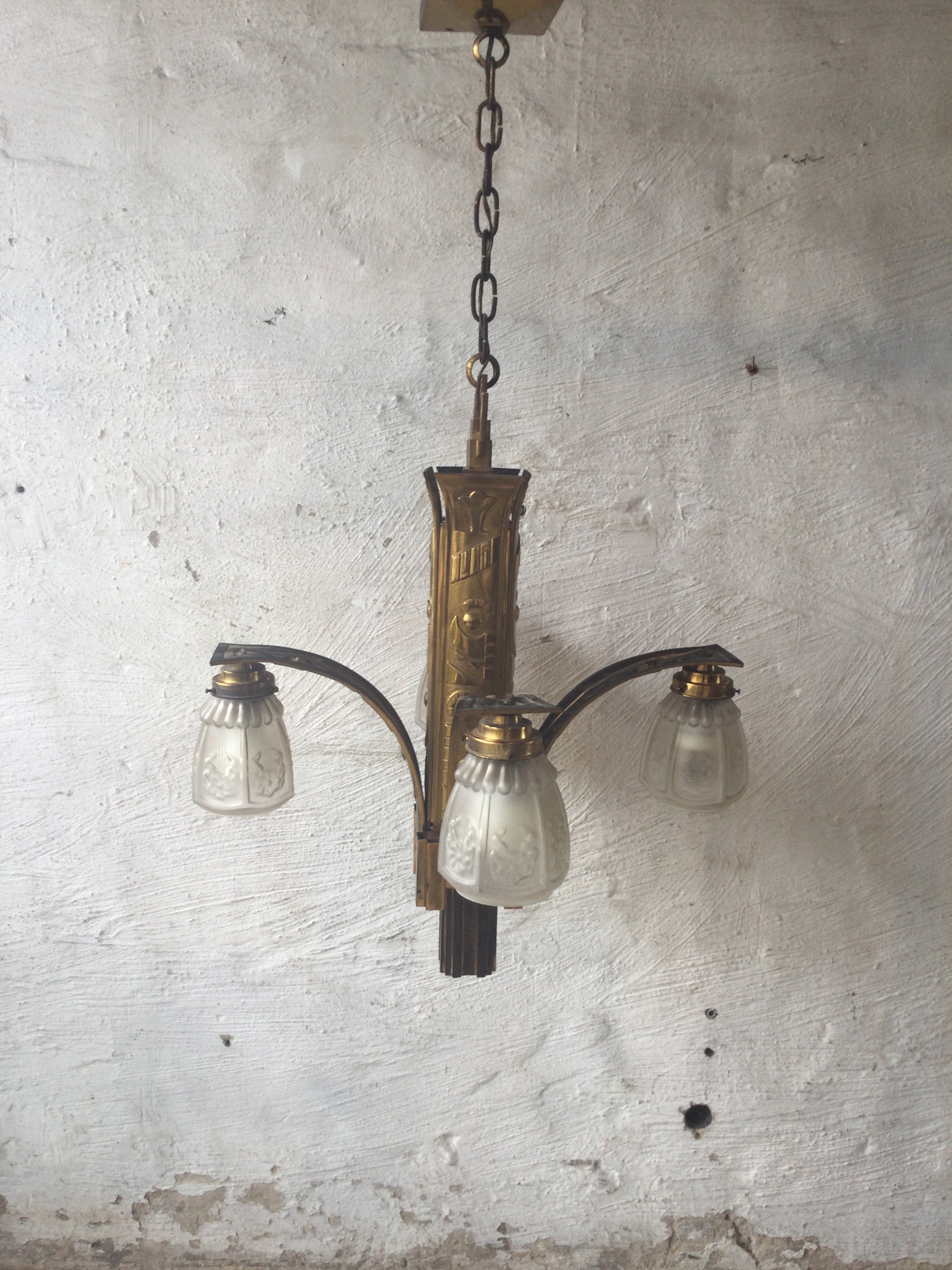 Art Deco chandelier in gold plated brass with four lightpoints.