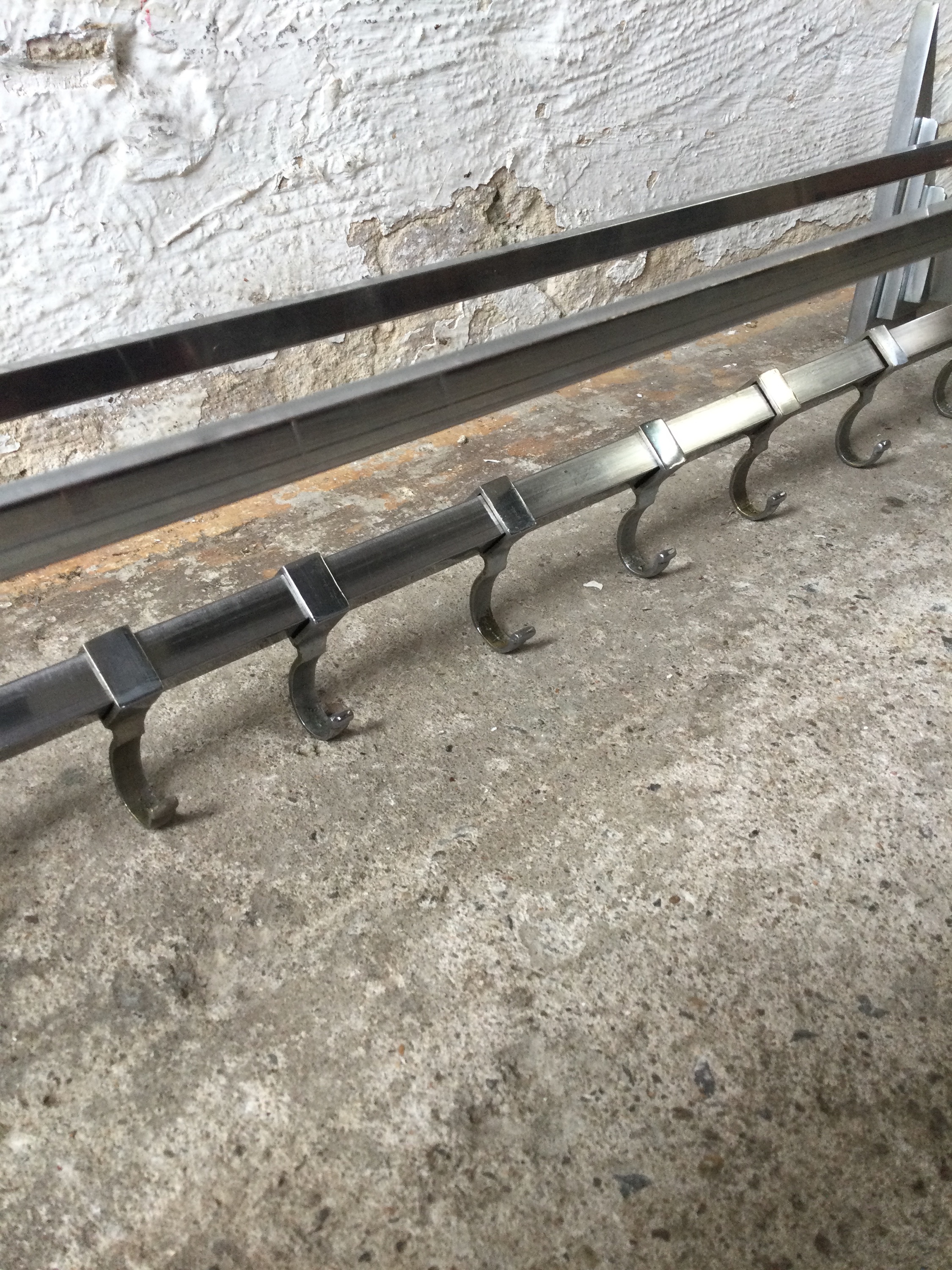 Chrome Art Deco coat rack with ten hooks and two chrome bars.