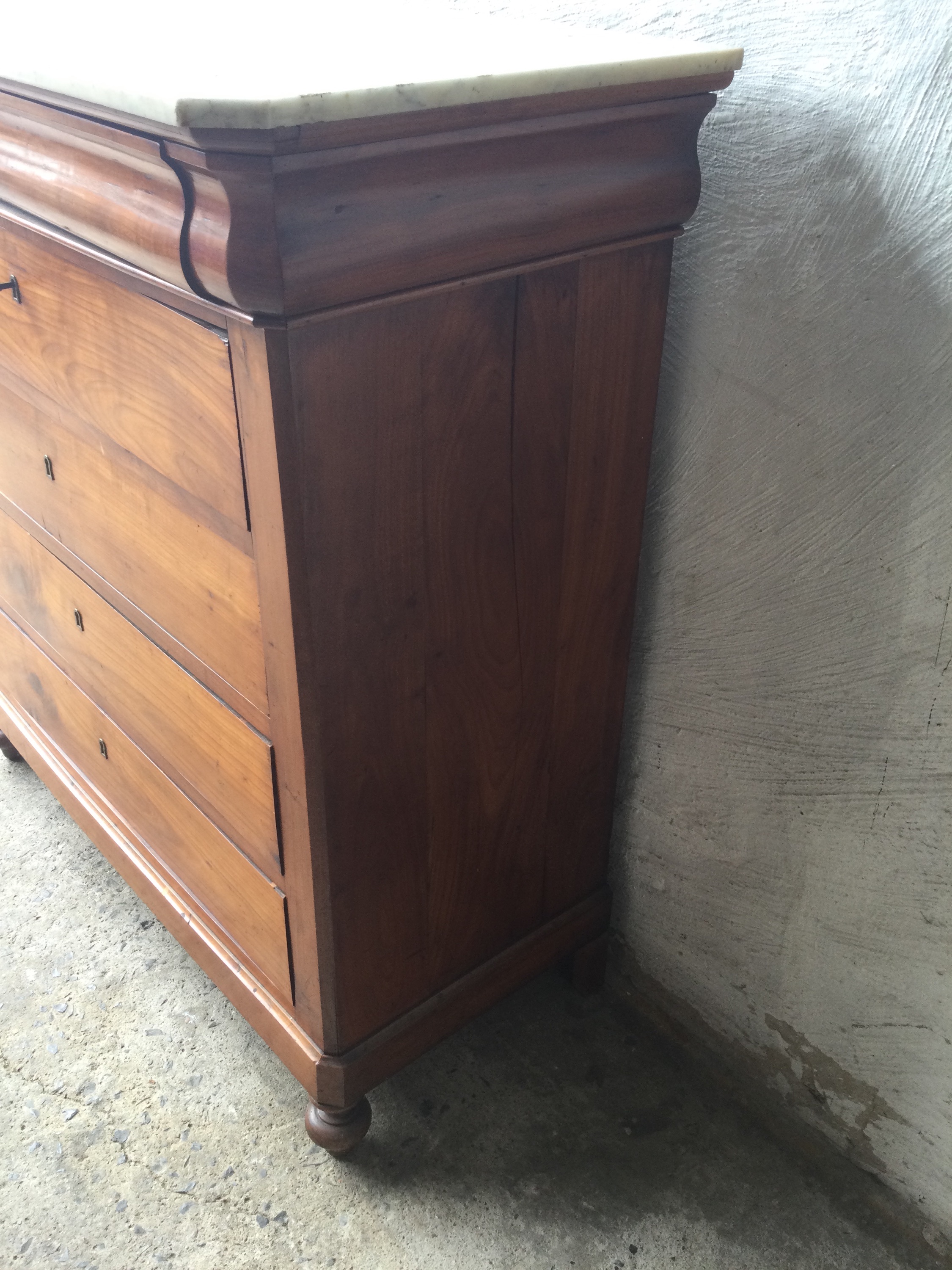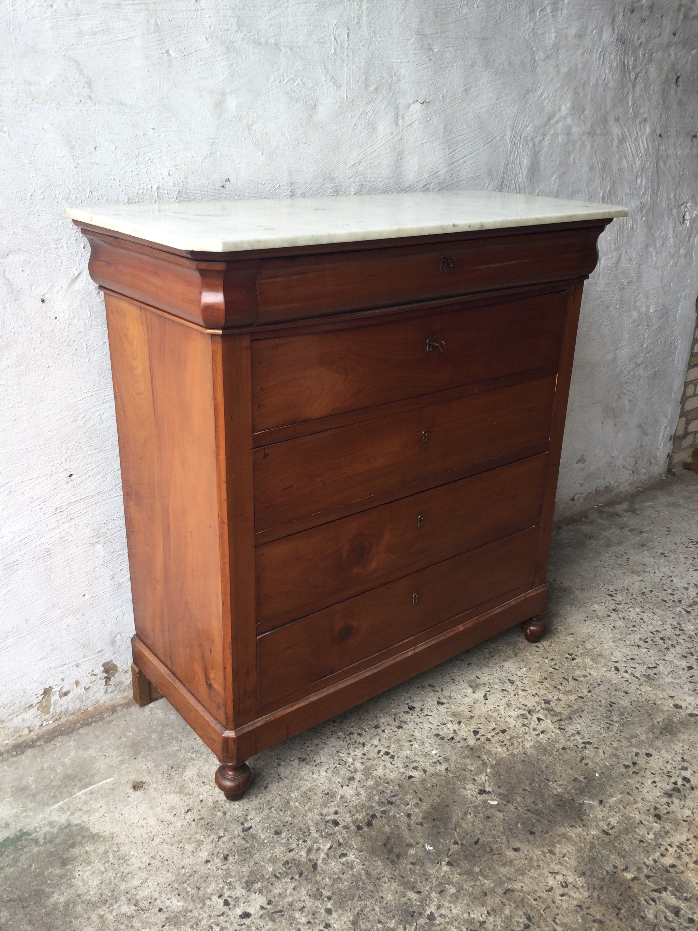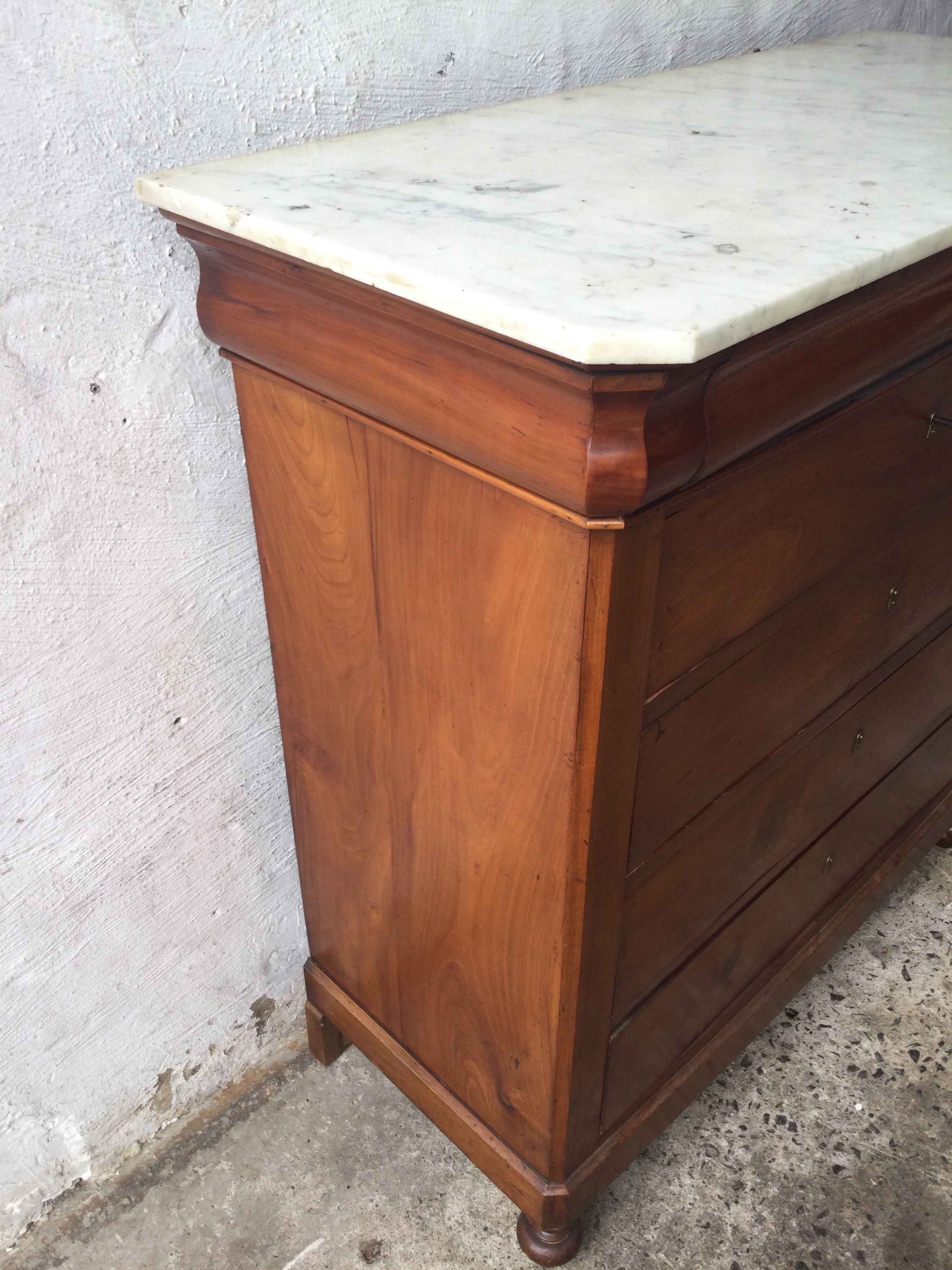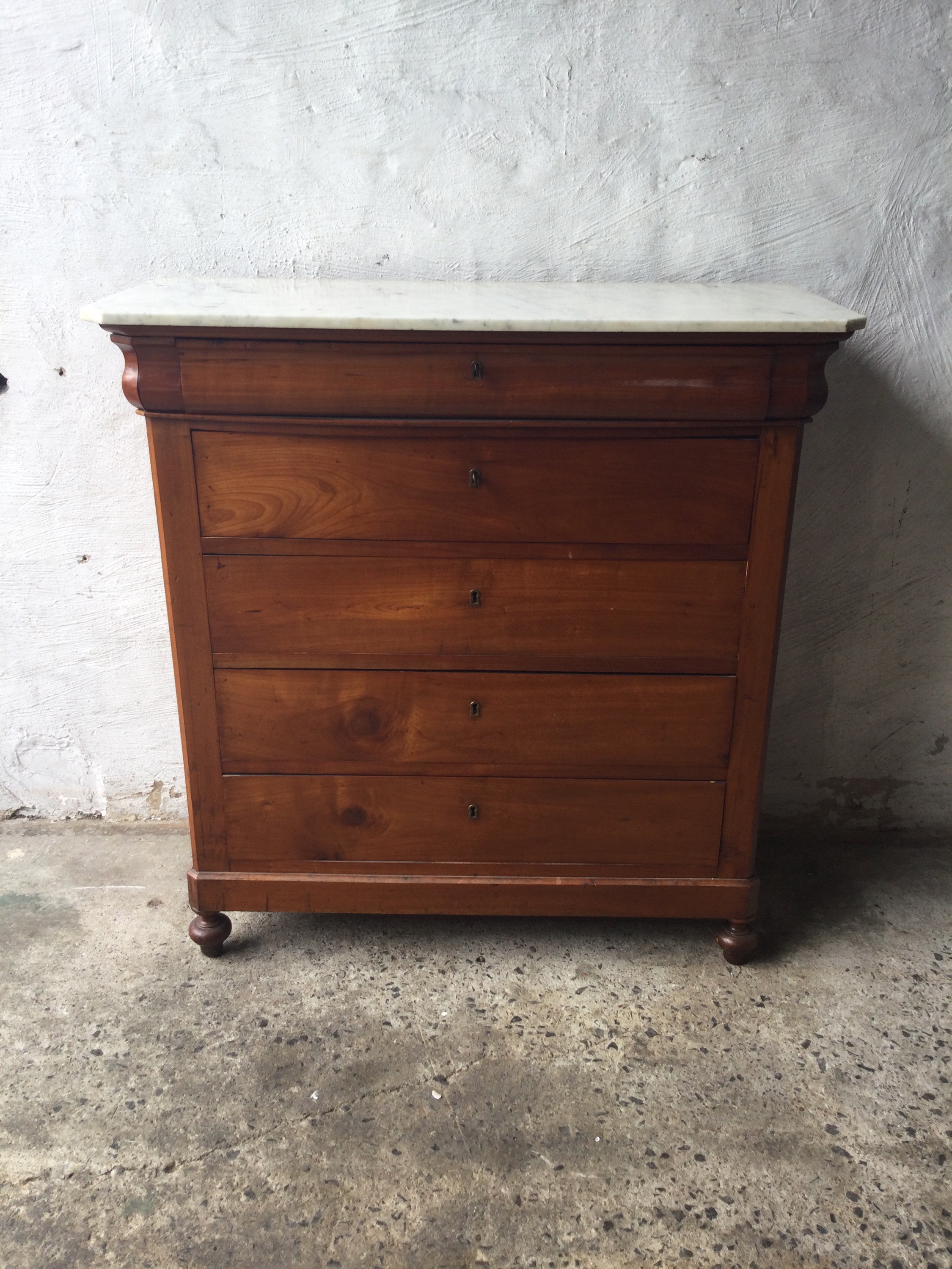 Antique Louis Philippe chest of drawers in cherrywood, with white marble top and five drawers, key included