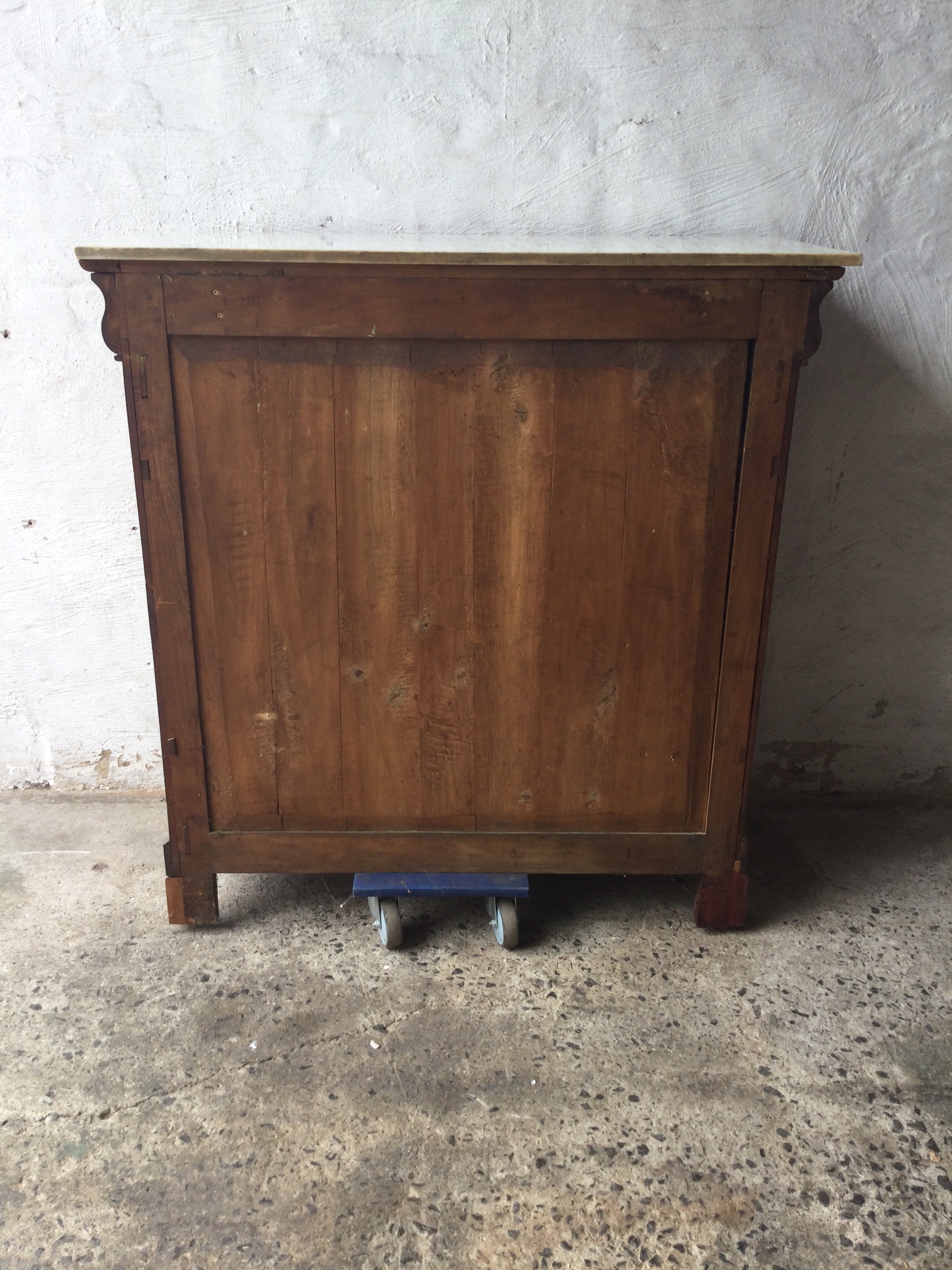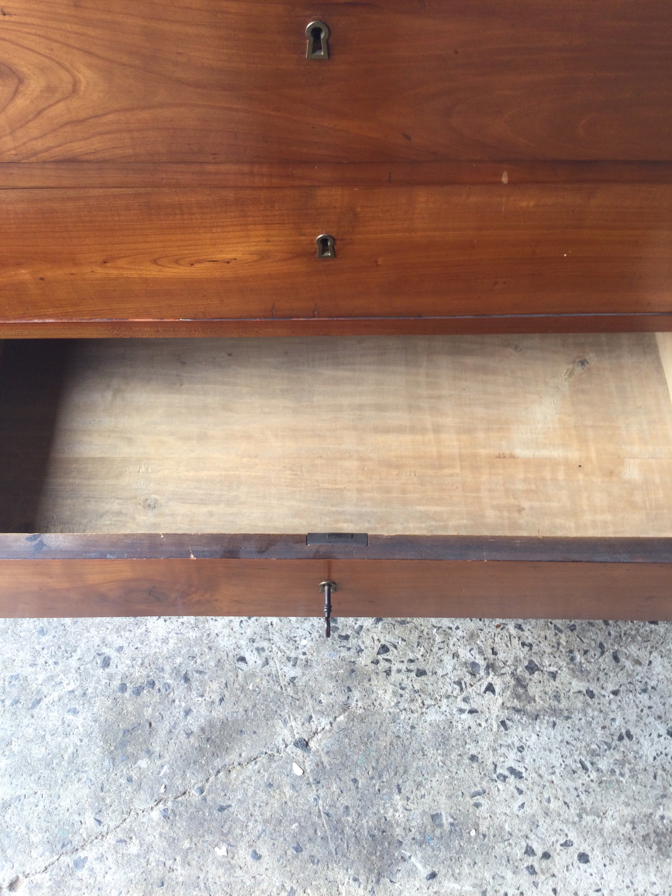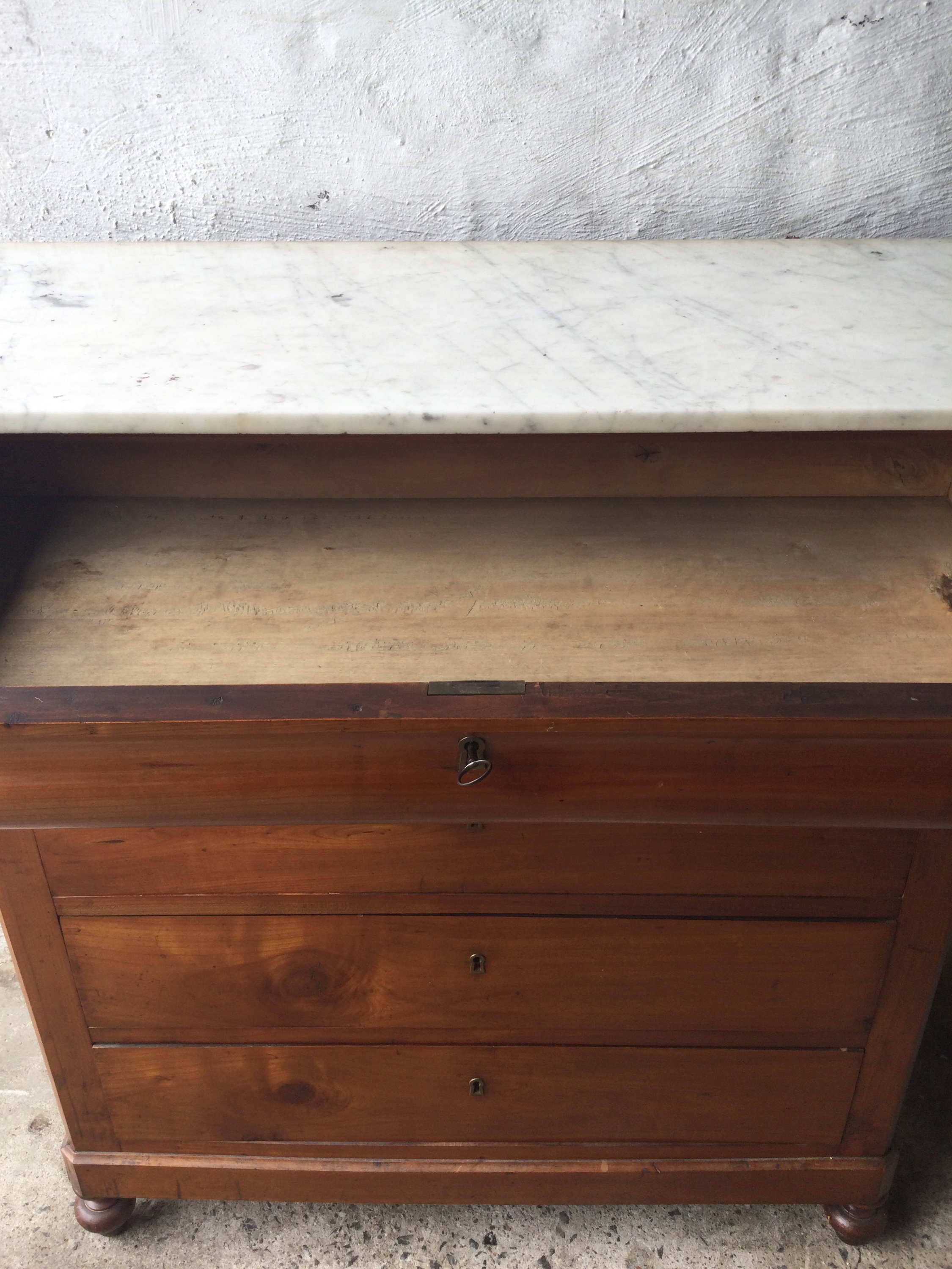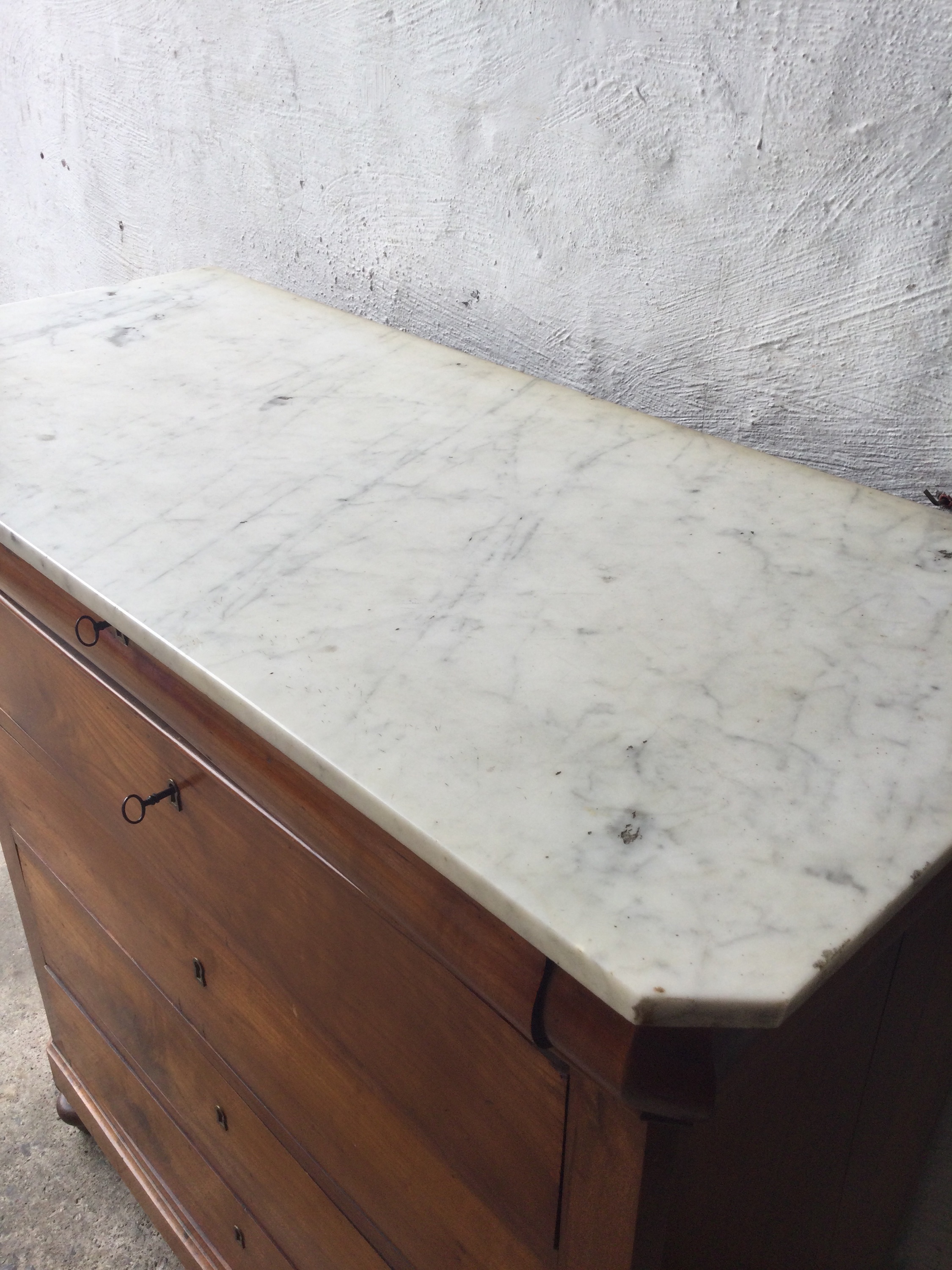 Antique Louis Philippe chest of drawers in cherrywood, with white marble top and five drawers, key included