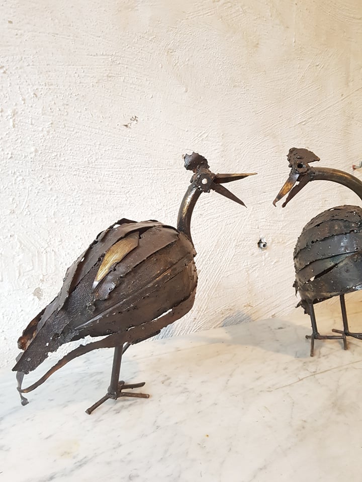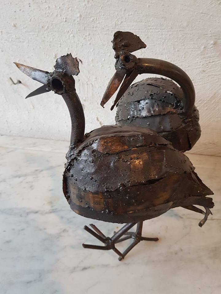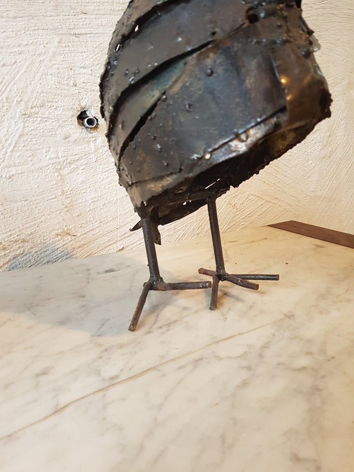 Freestanding iron artwork chickens .