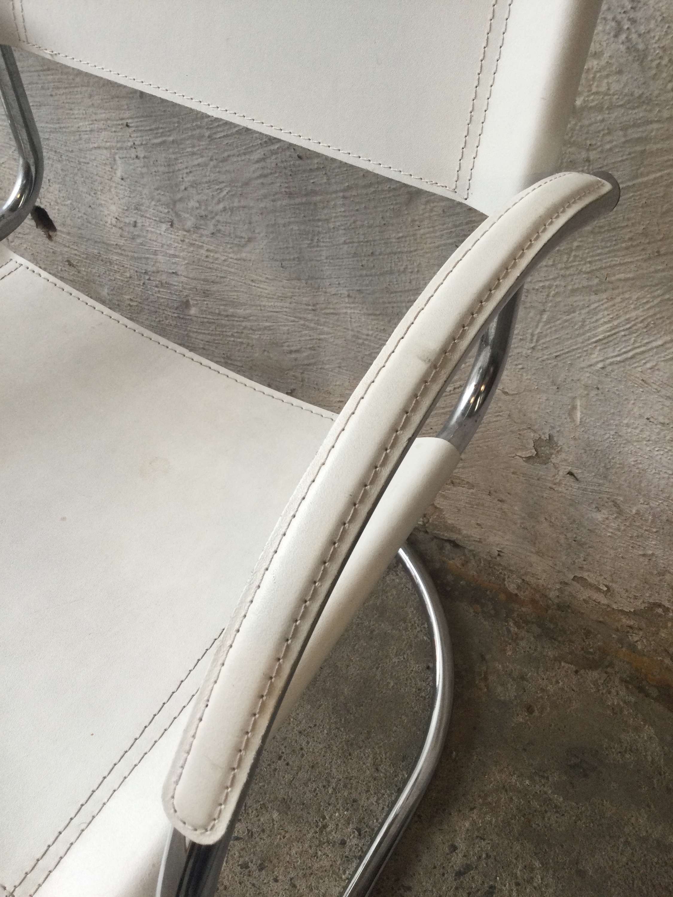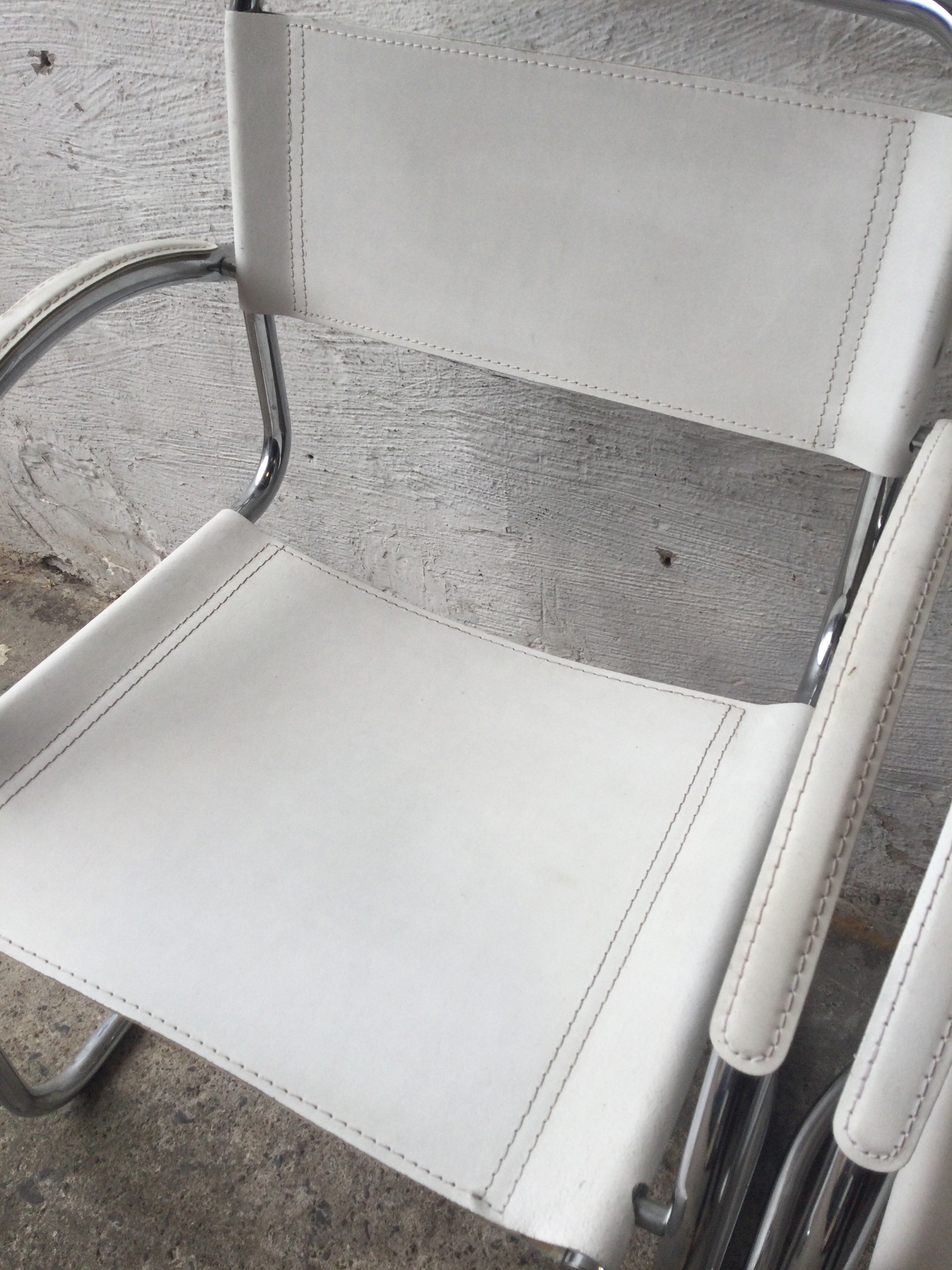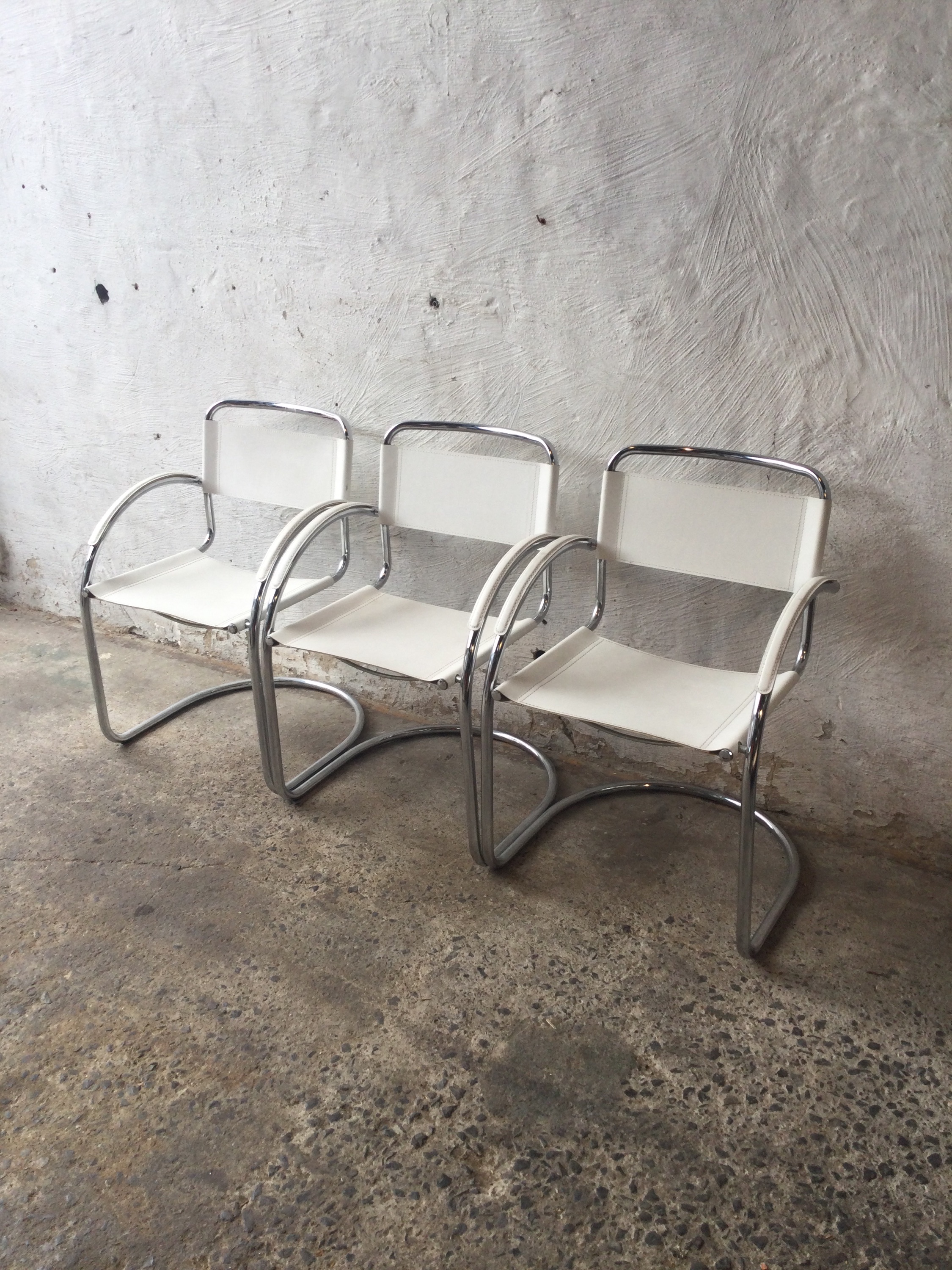 Set of three chairs in white leather, curved base,made in Italy, style Marcel Breuer. 1970s