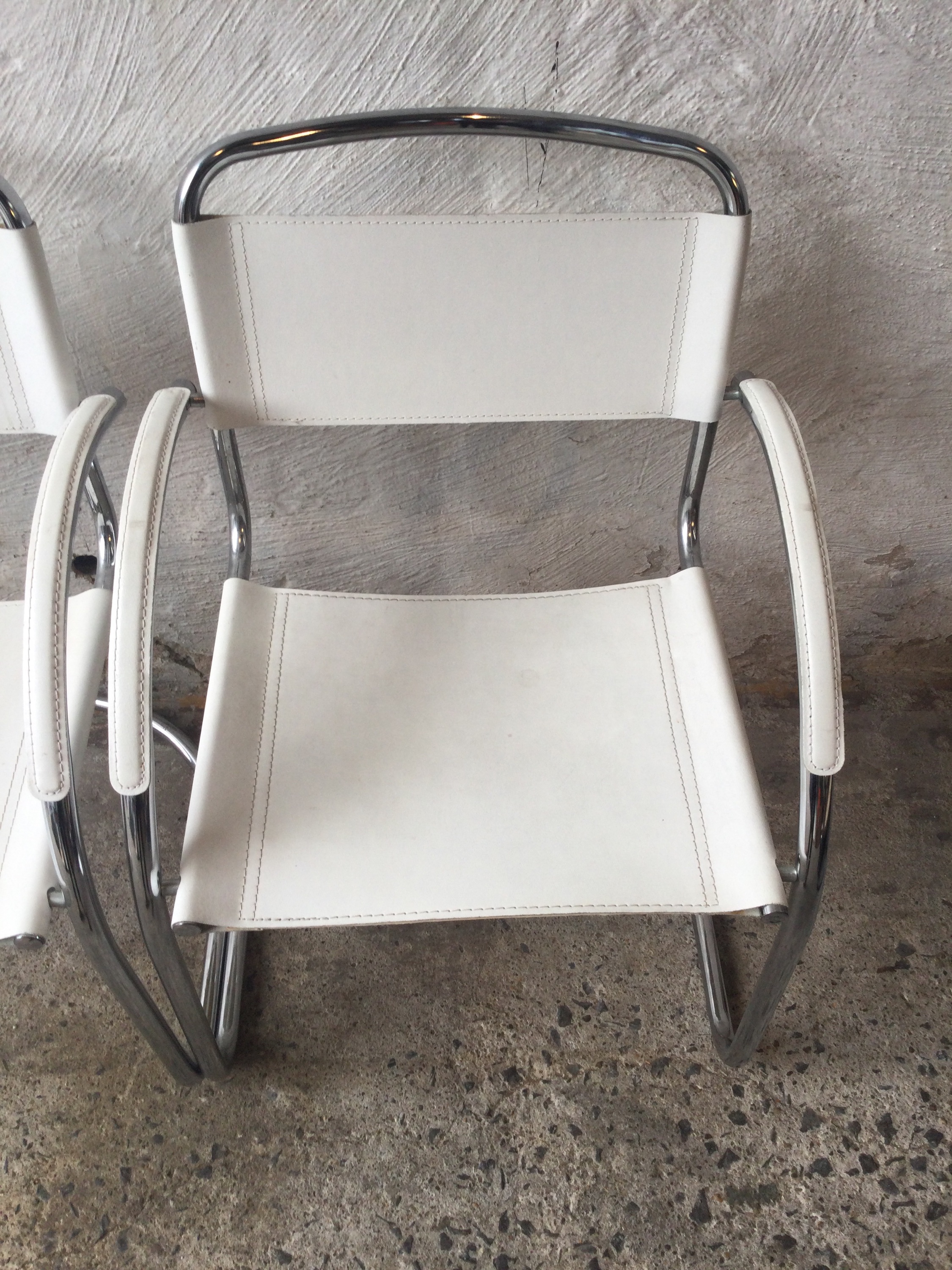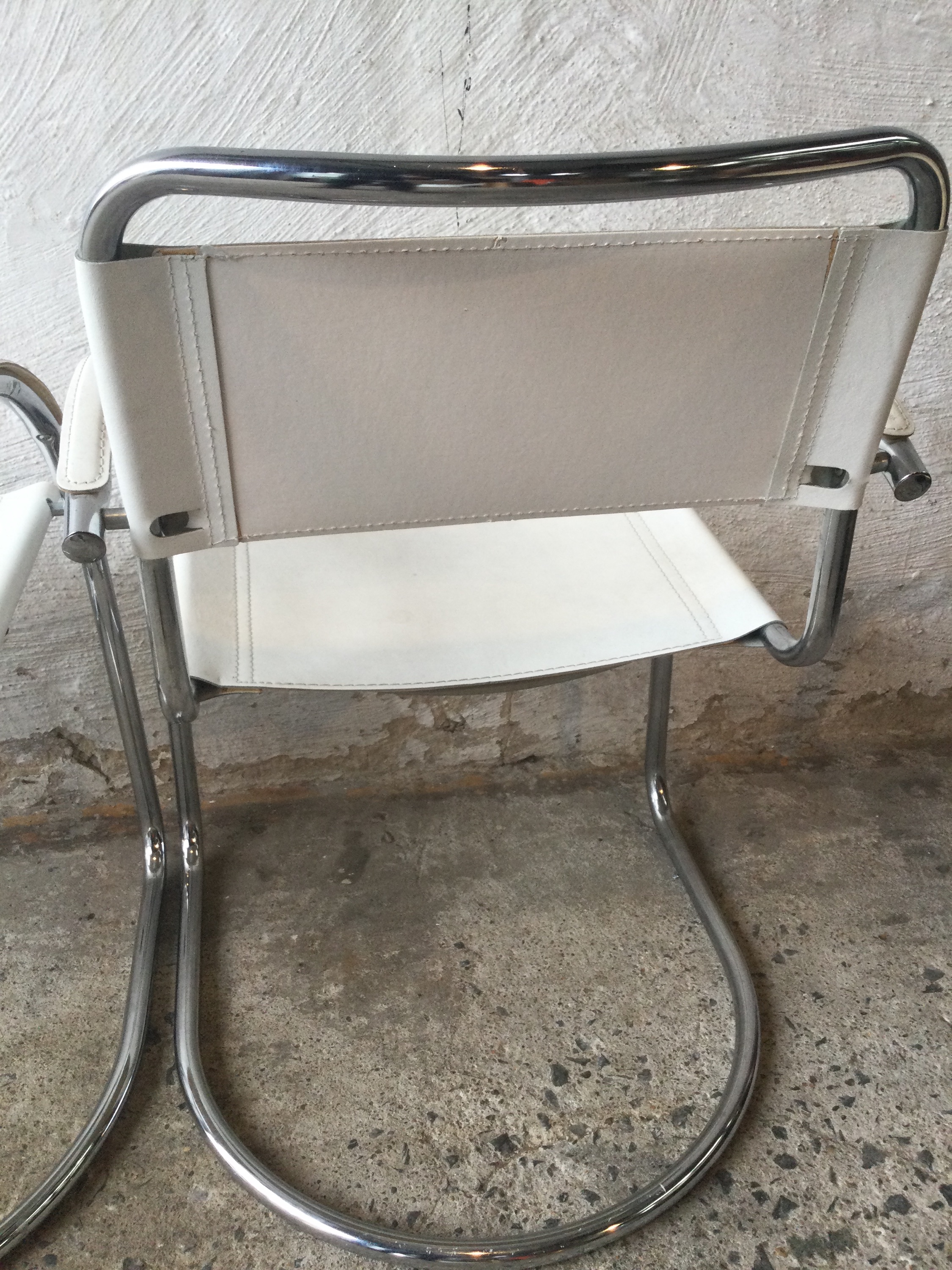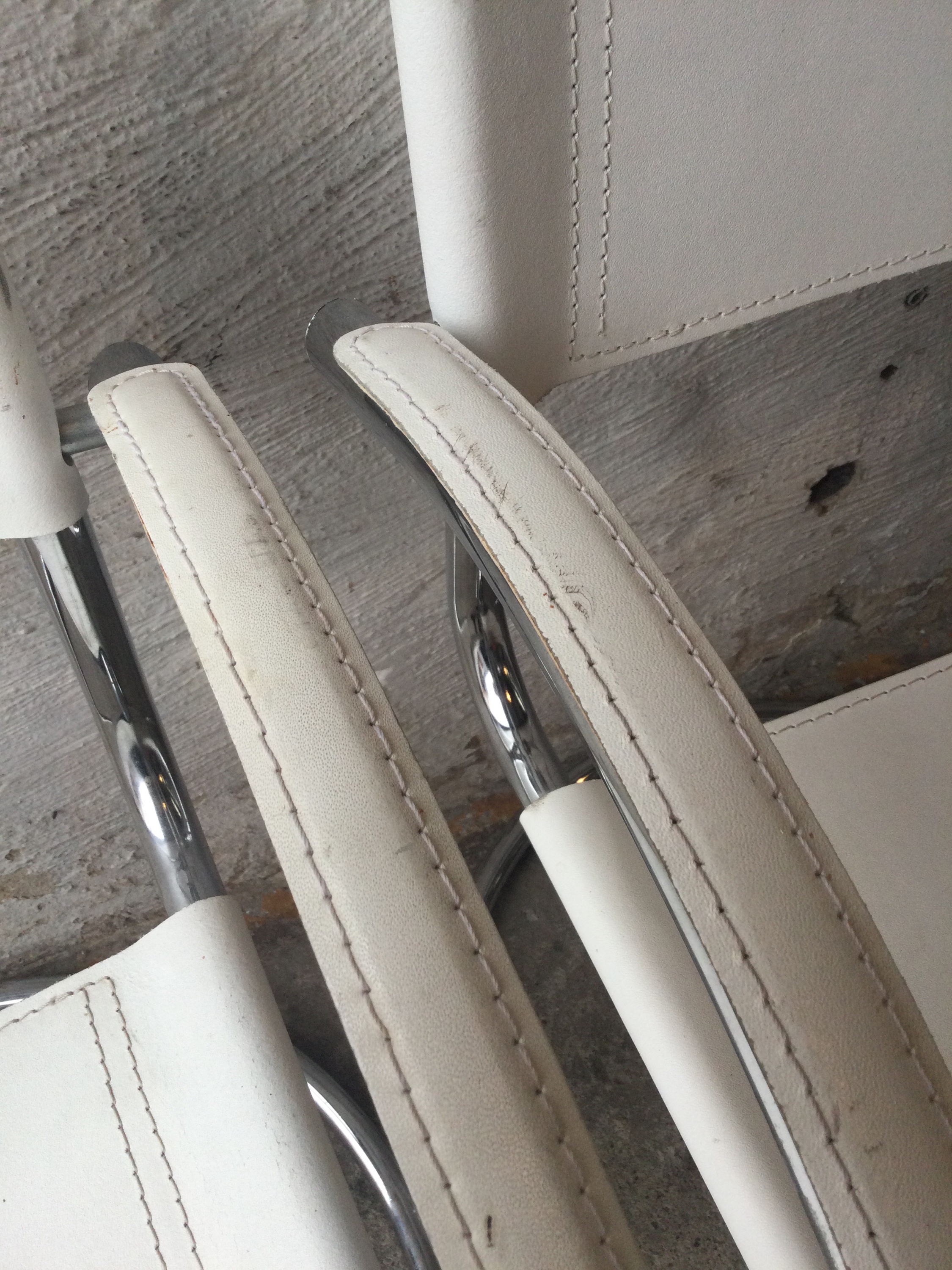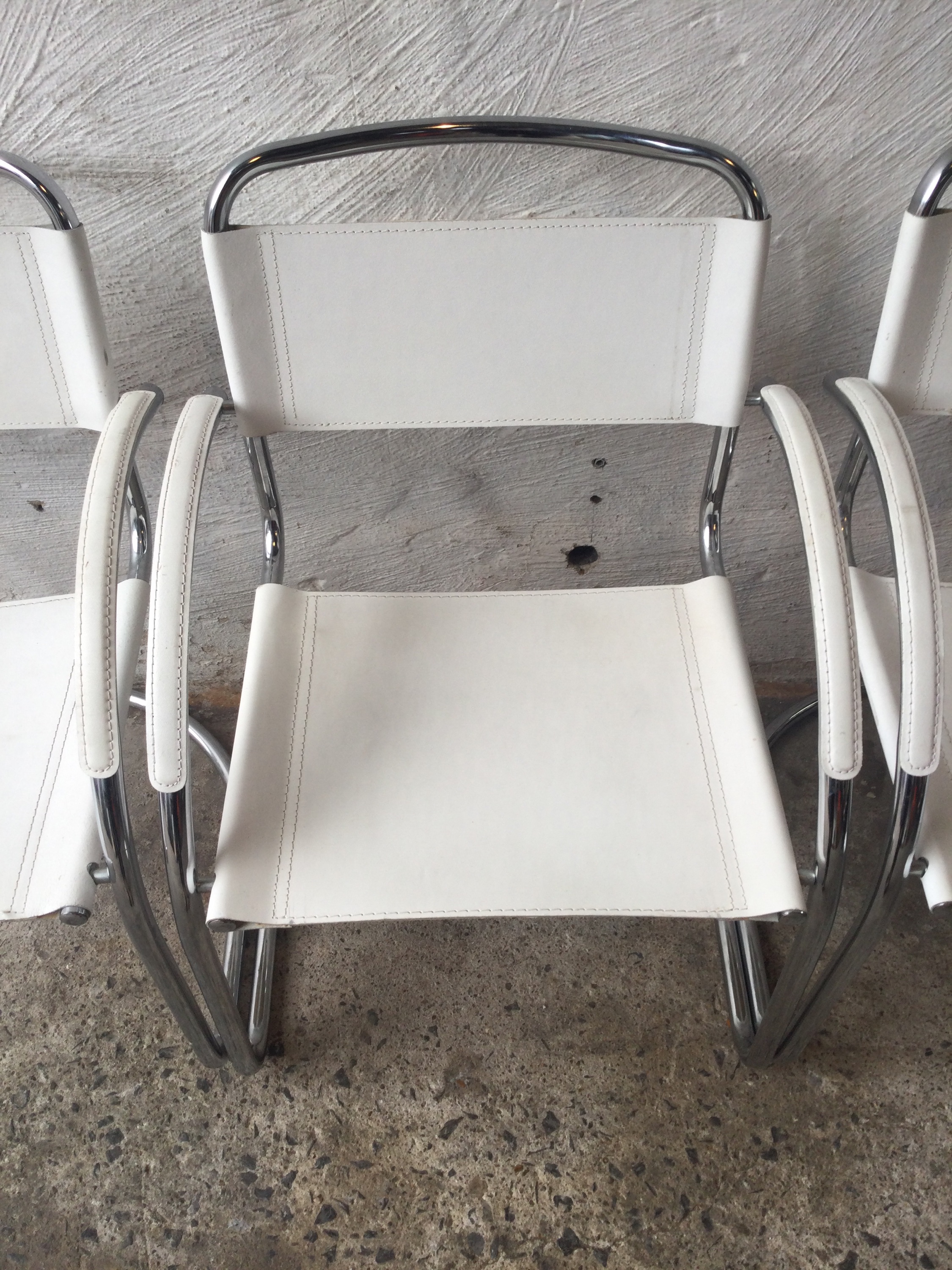 Set of three chairs in white leather, curved base,made in Italy, style Marcel Breuer. 1970s