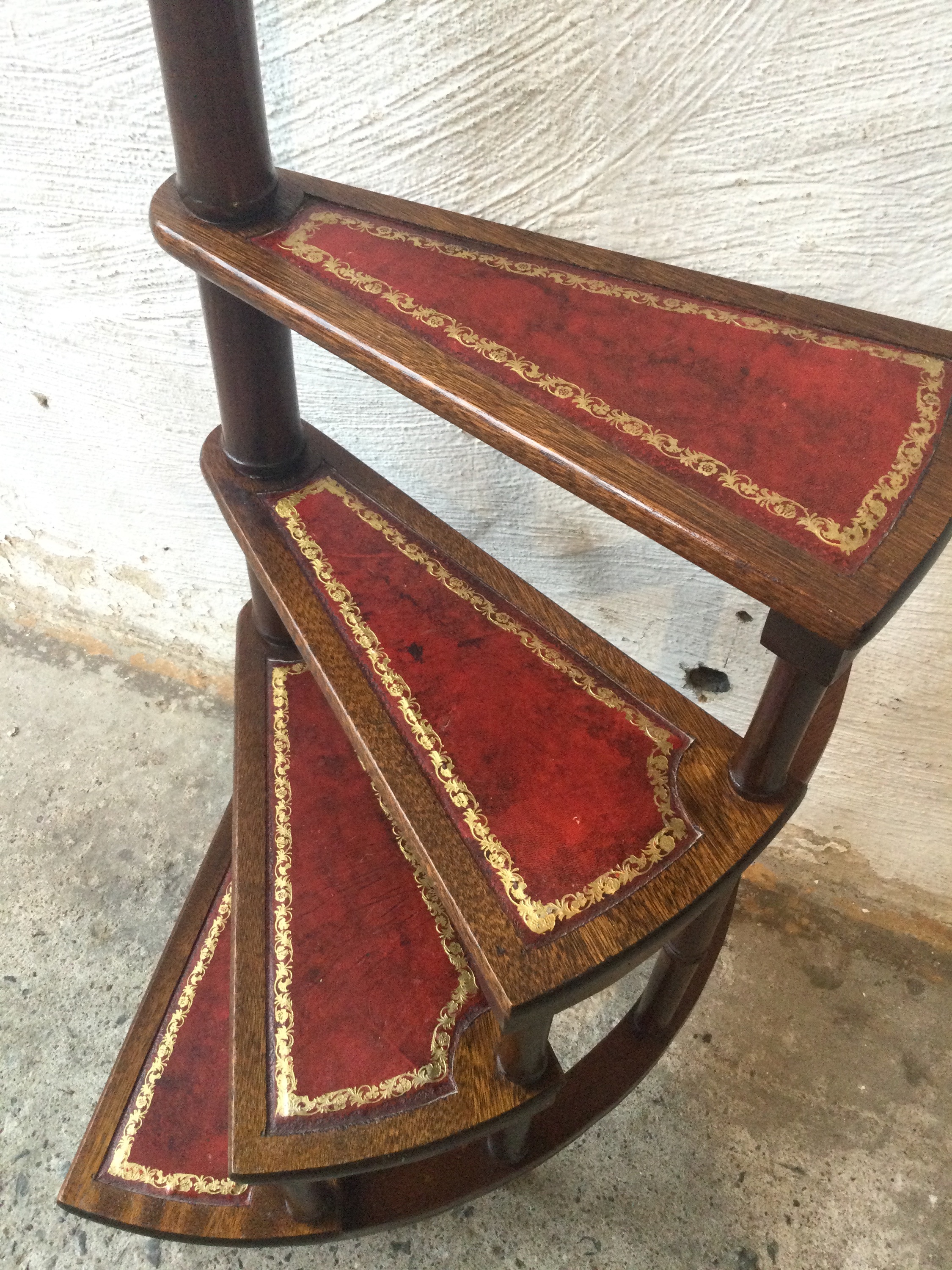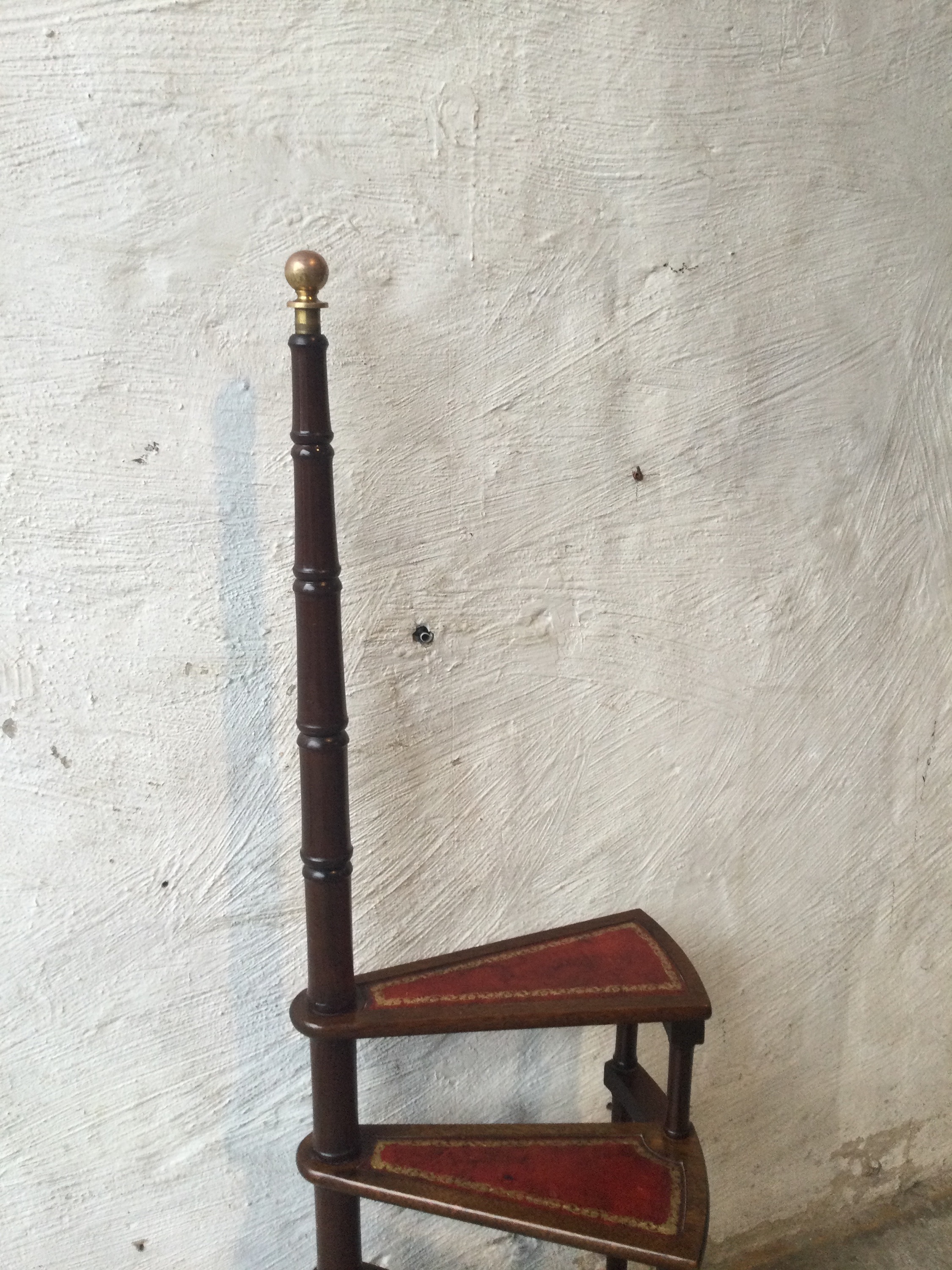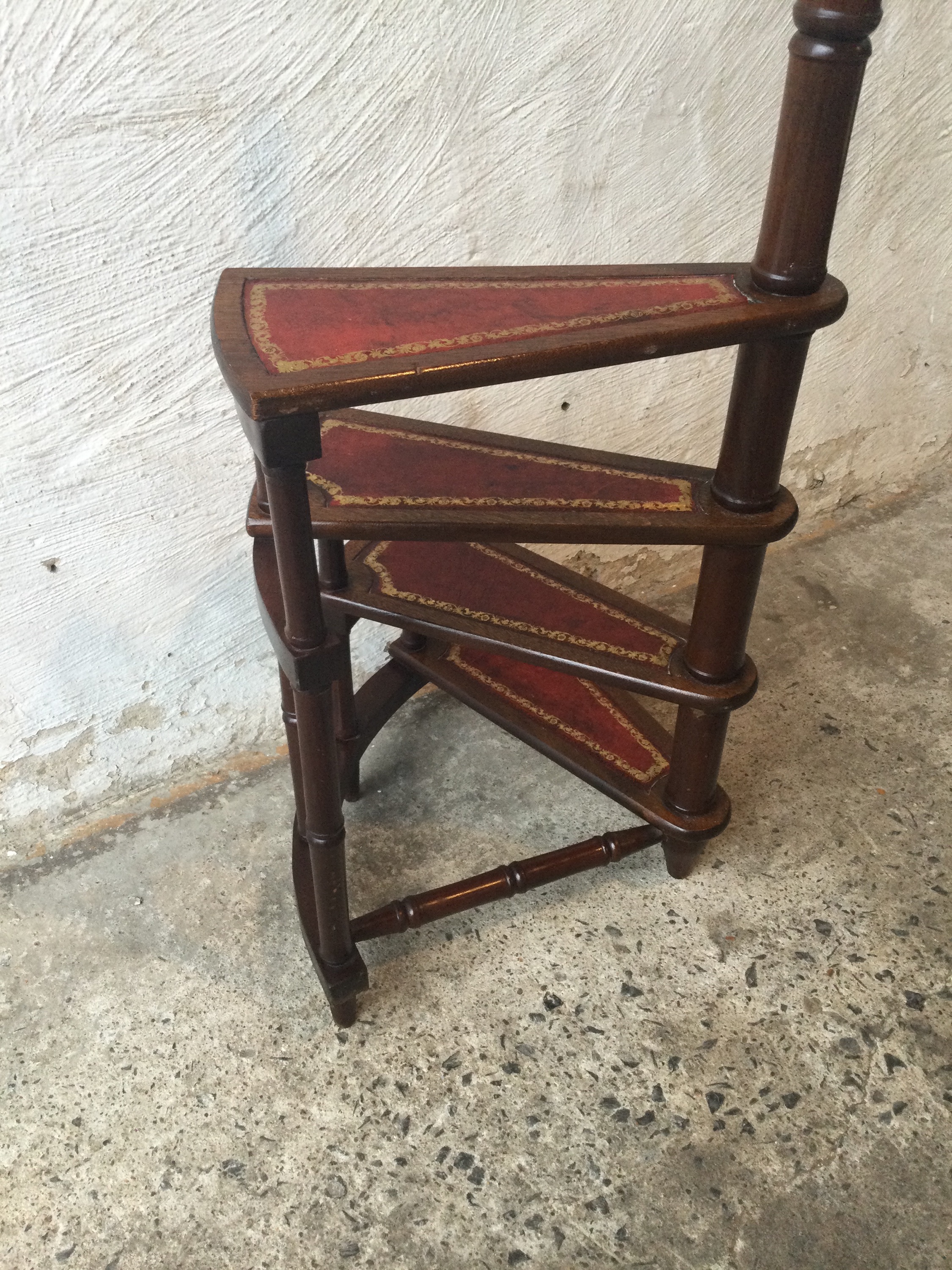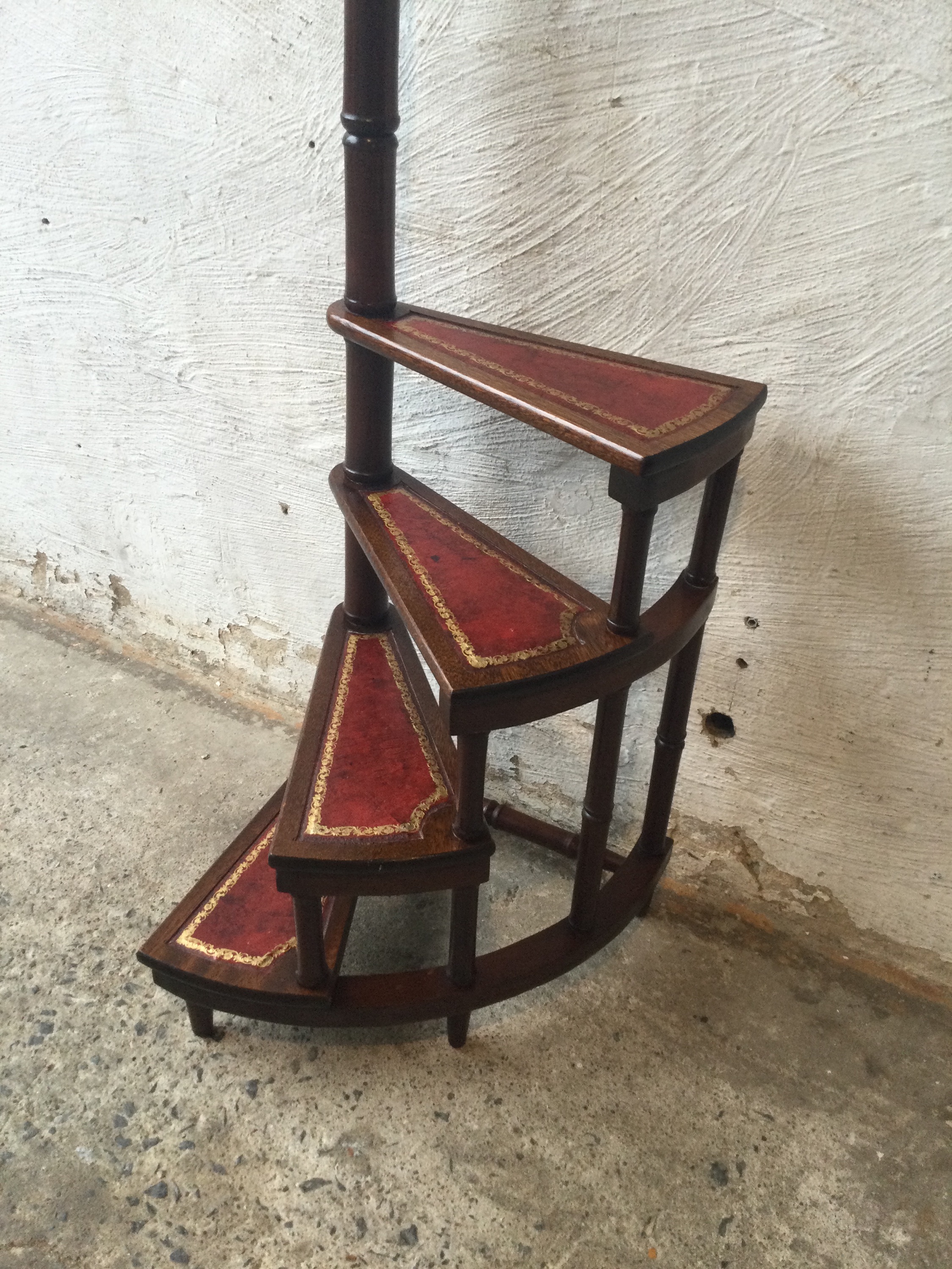 Library stepladder in mahogany, with four steps that are covered in red burgundy leather.