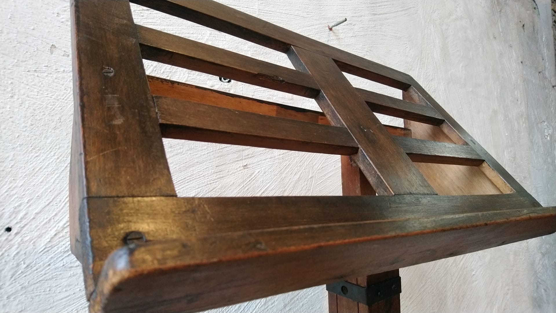 Music stand from the 1930-’40s The stand is adjustable in height with a maximum height of 160cm There’s some wear to the wood and a slight slant to the top