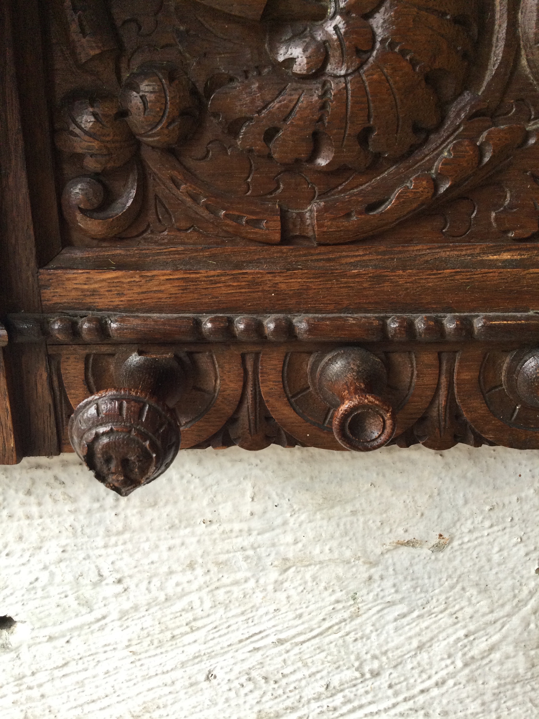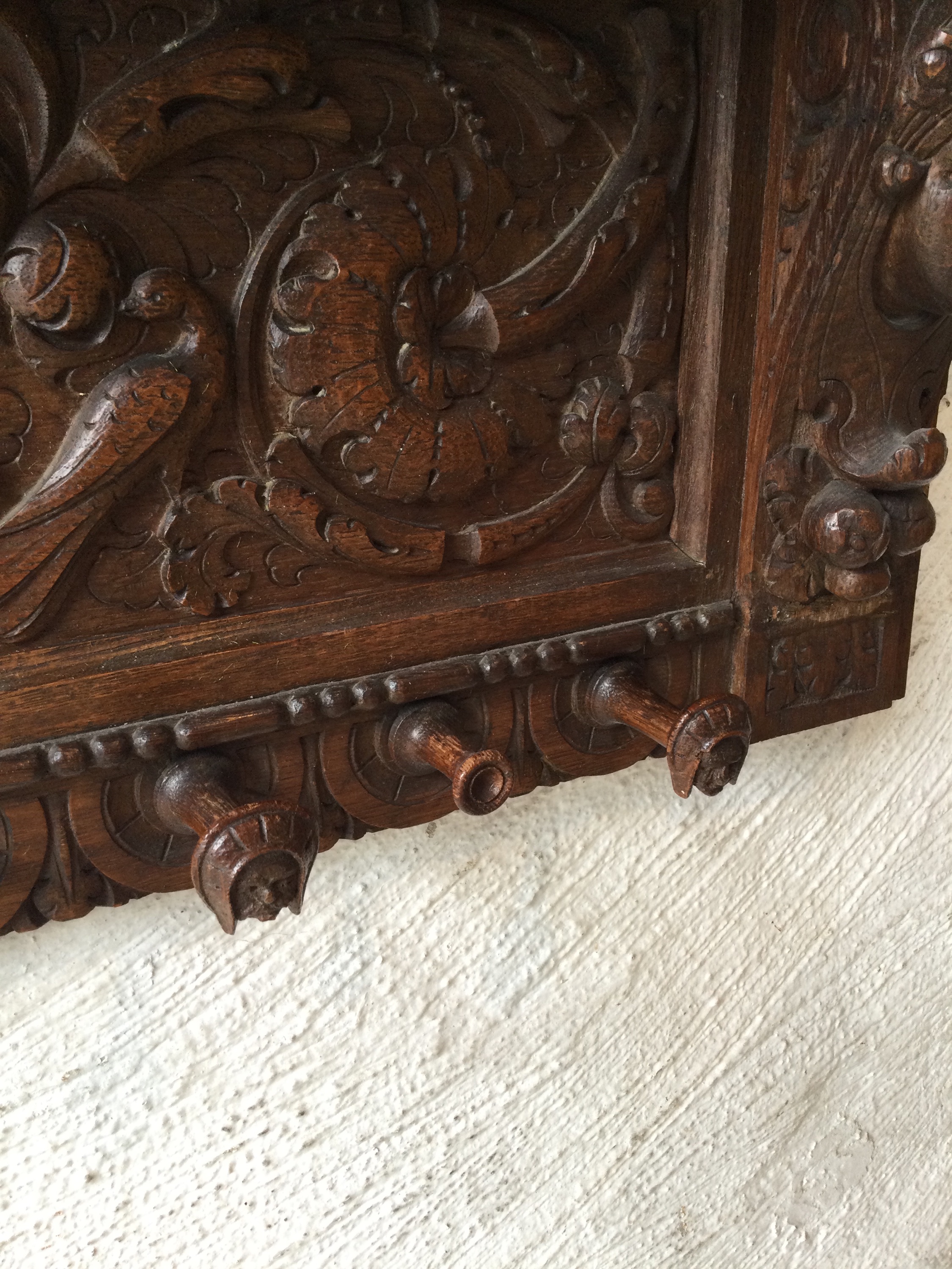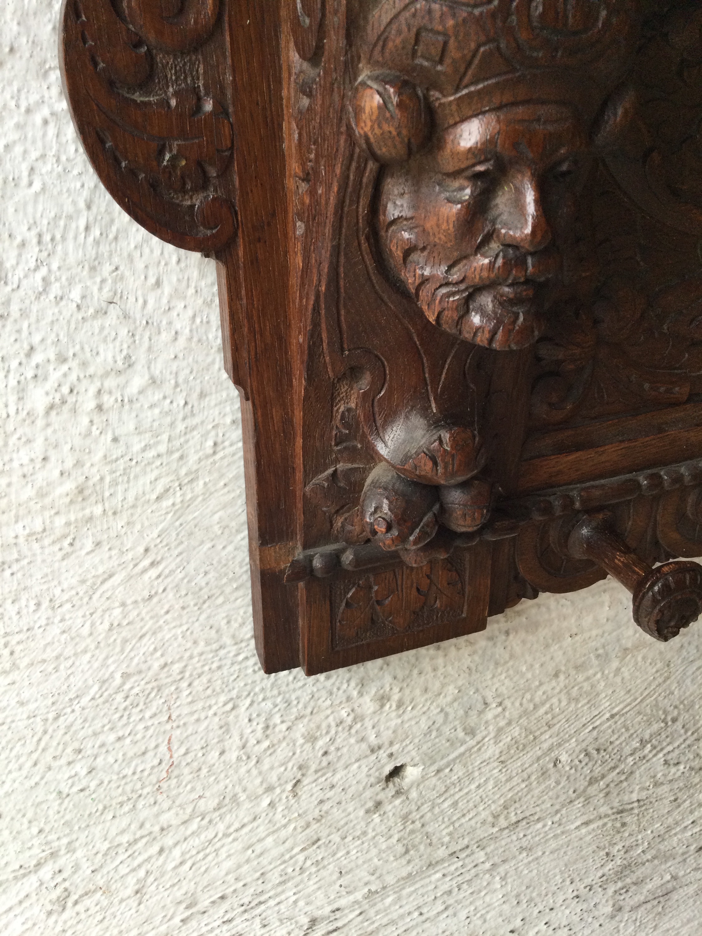 Oak coat rack with wooden faces on the sides, the hooks also have faces.