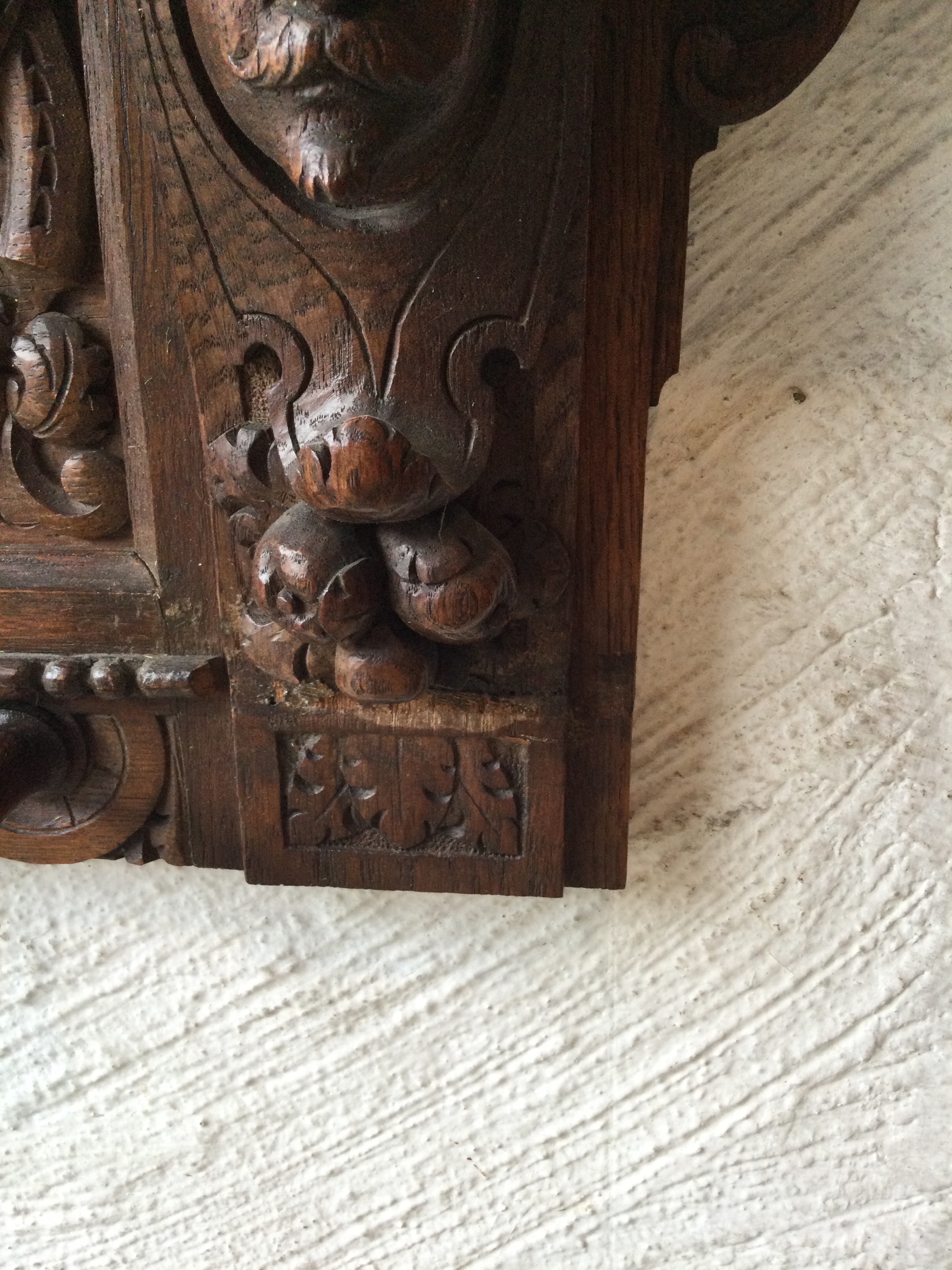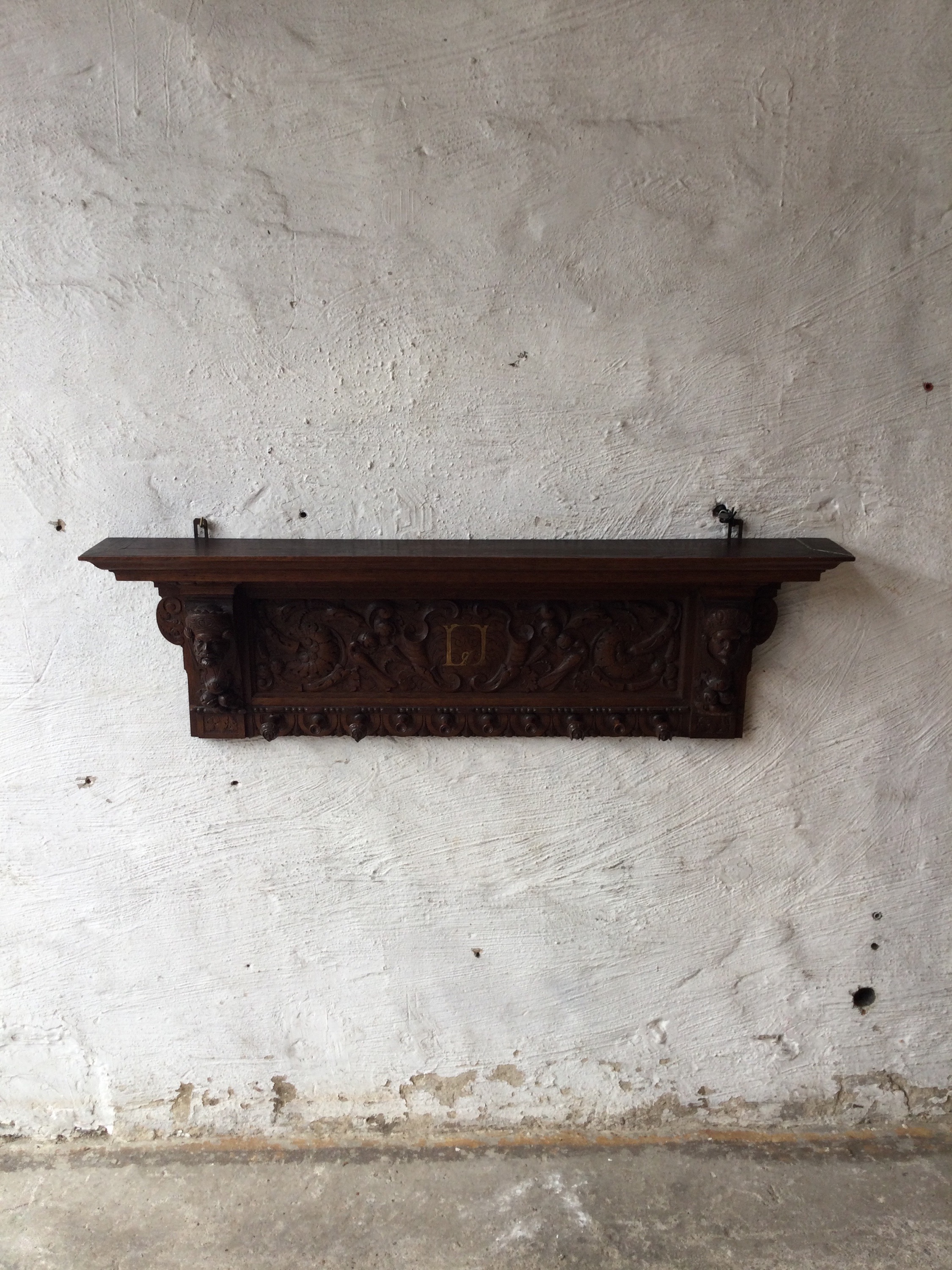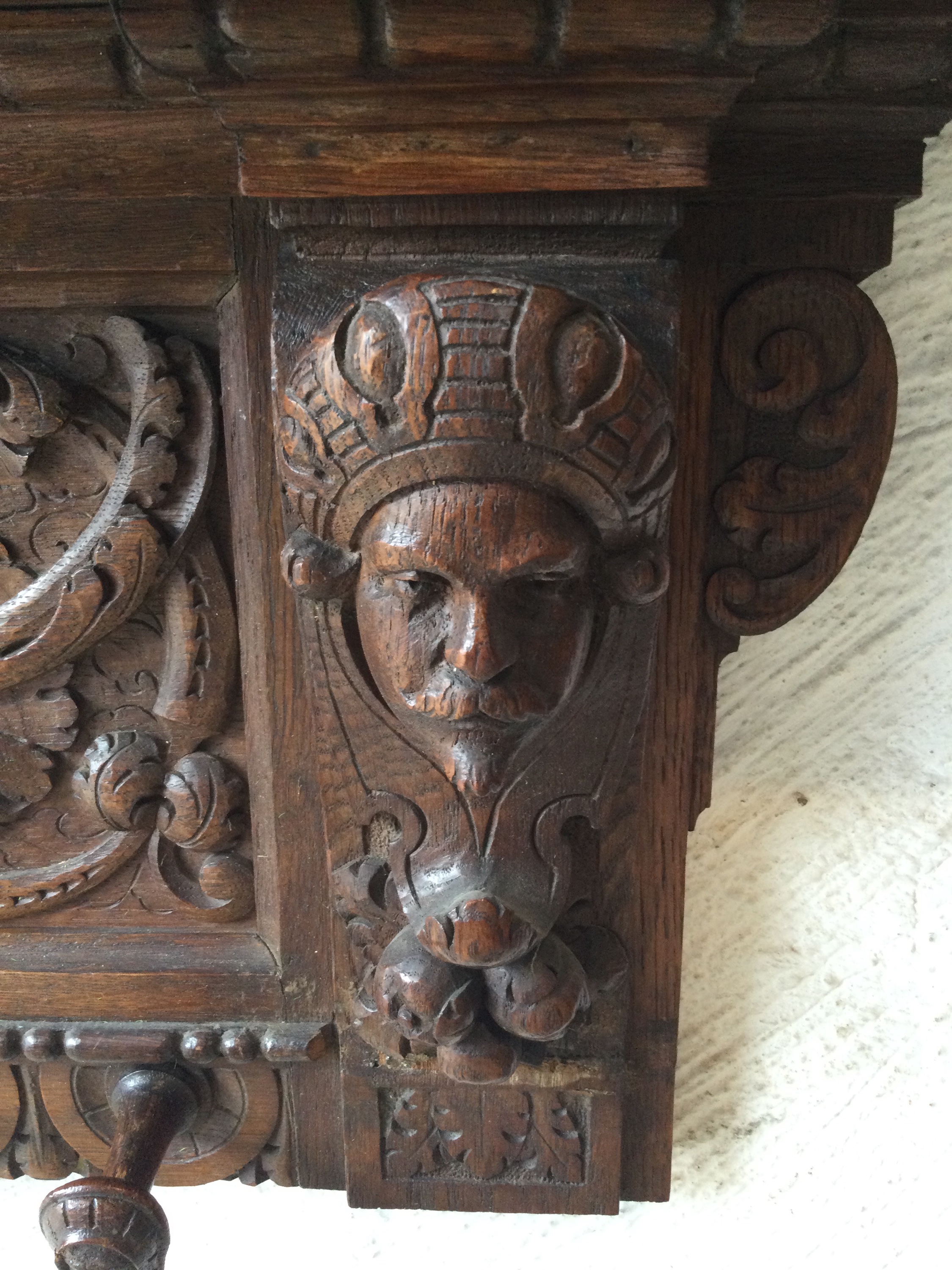 Oak coat rack with wooden faces on the sides, the hooks also have faces.