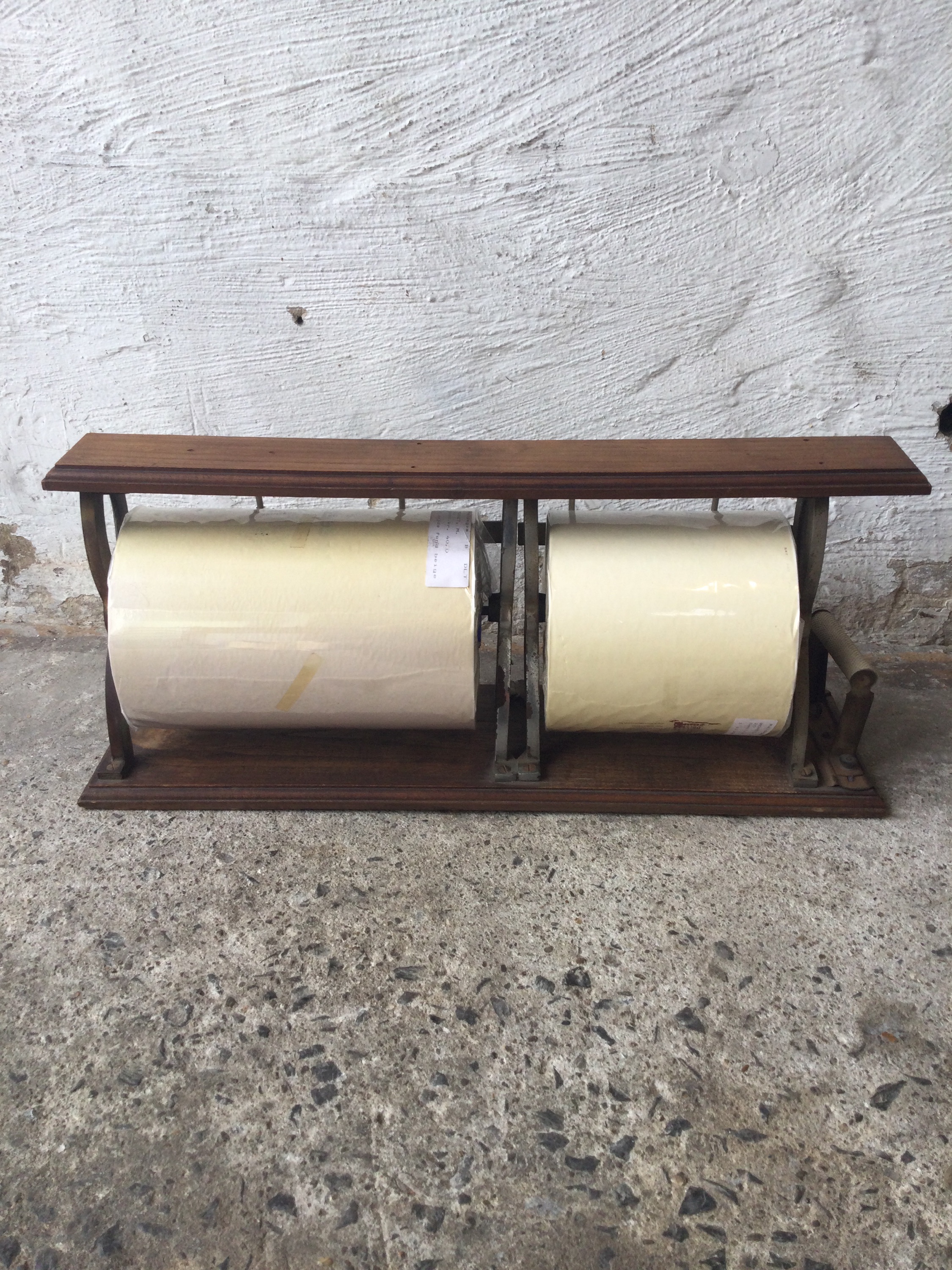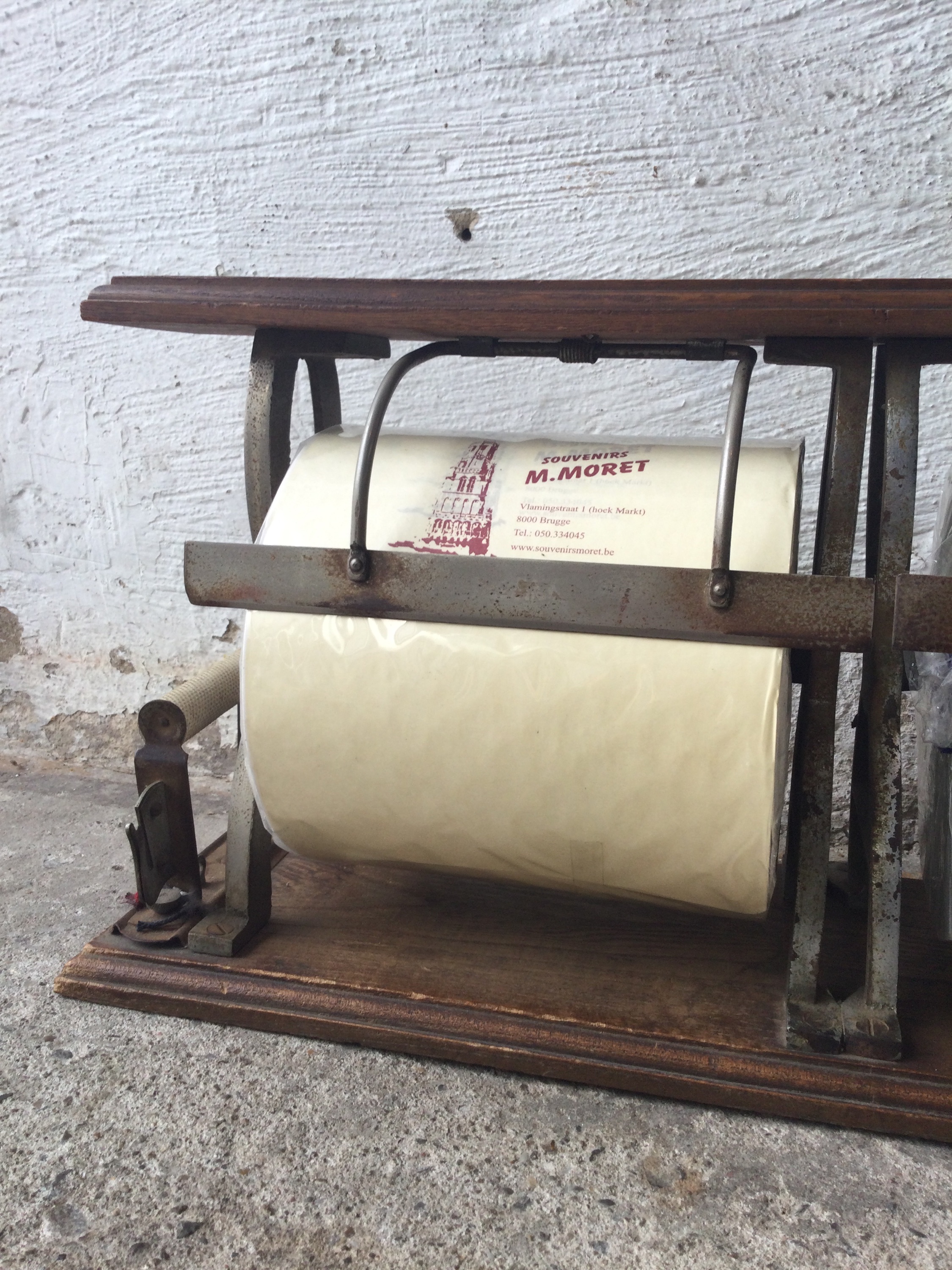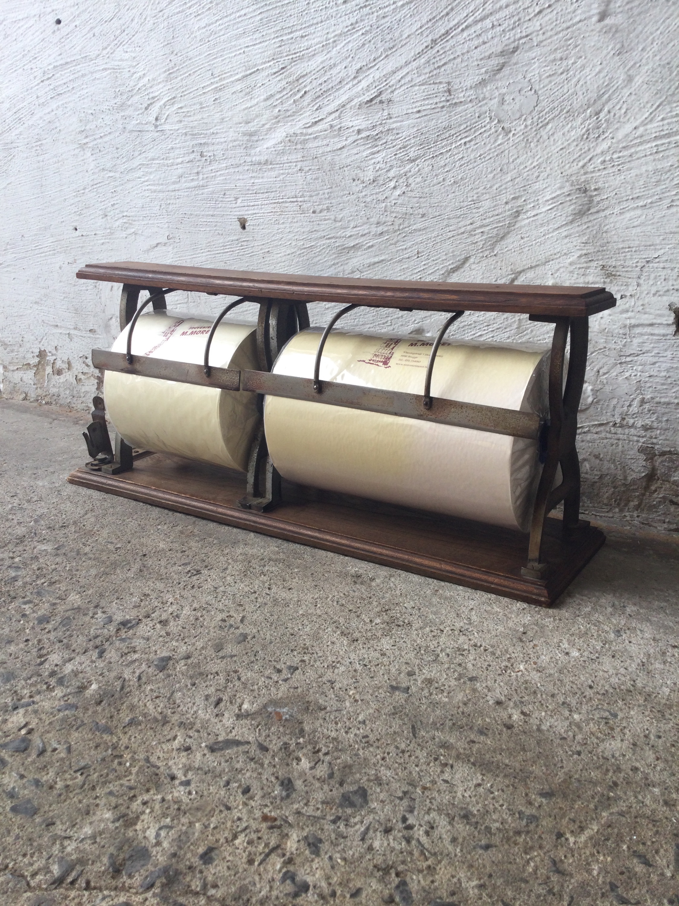 Antique paper roll holder in cast iron and beautiful patina on the wood, circa 1920s