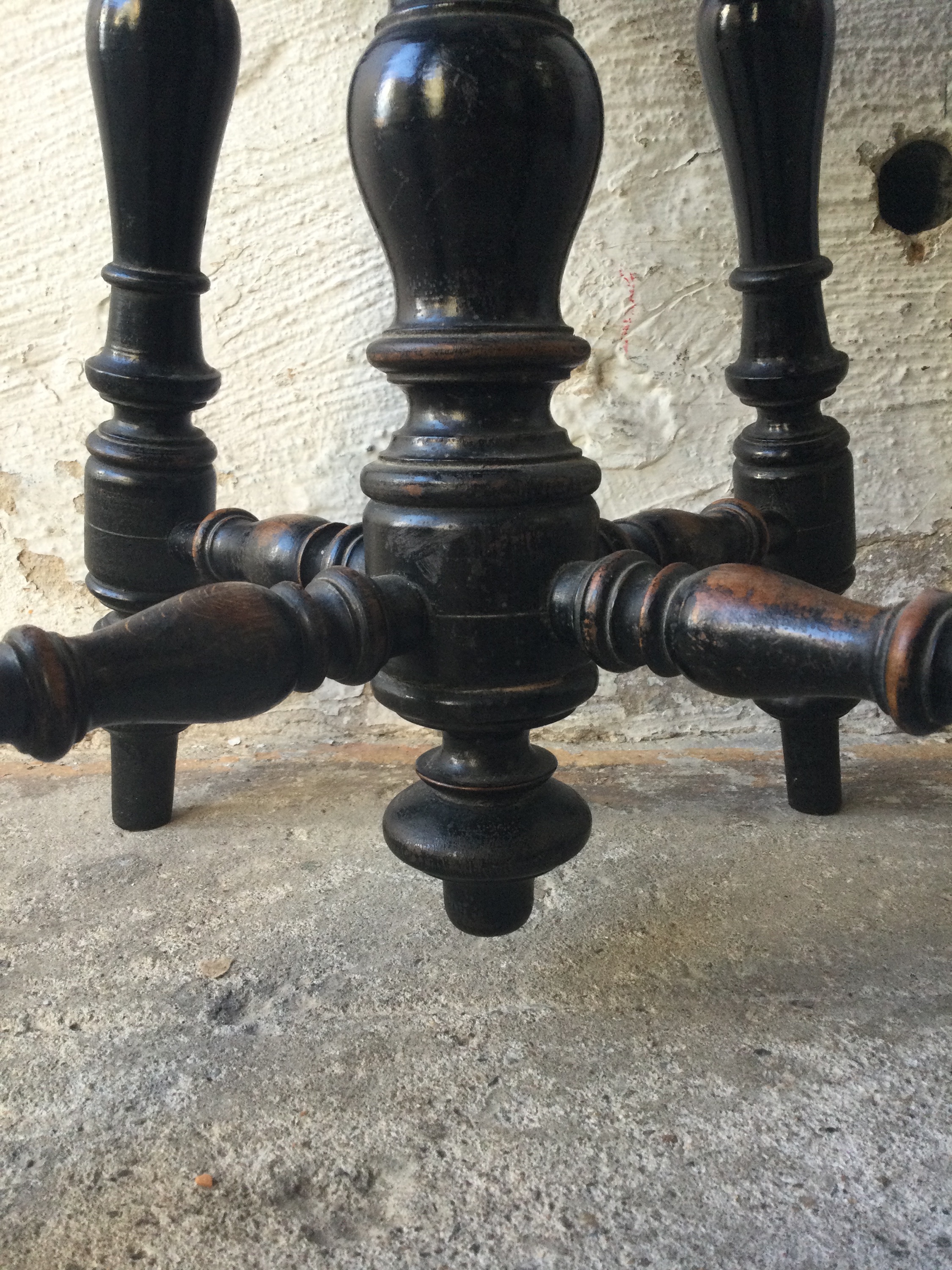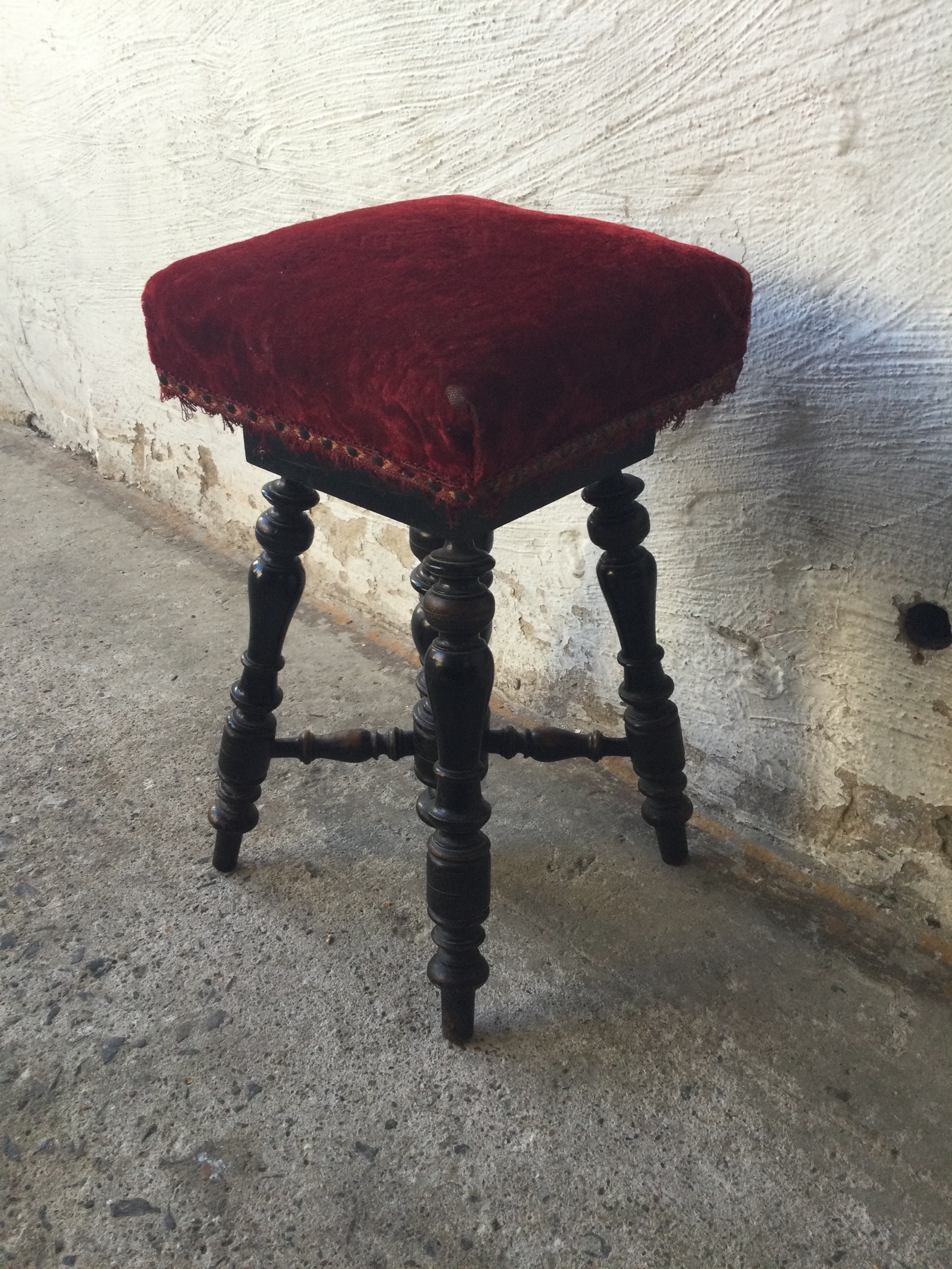 Wooden piano stool in black with rotating cushion seat in red fabric.