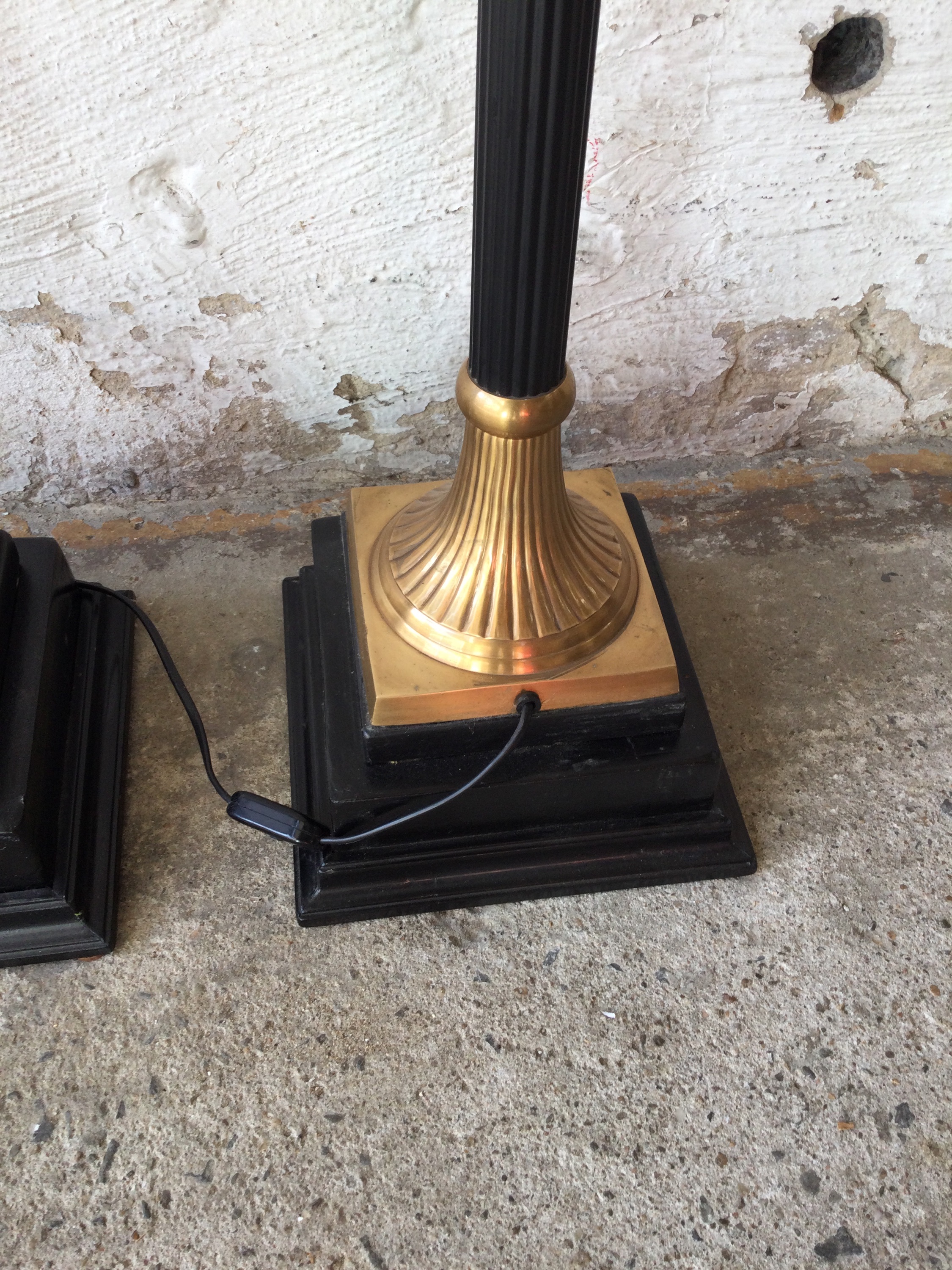 Set of two floor lamps with wooden base.