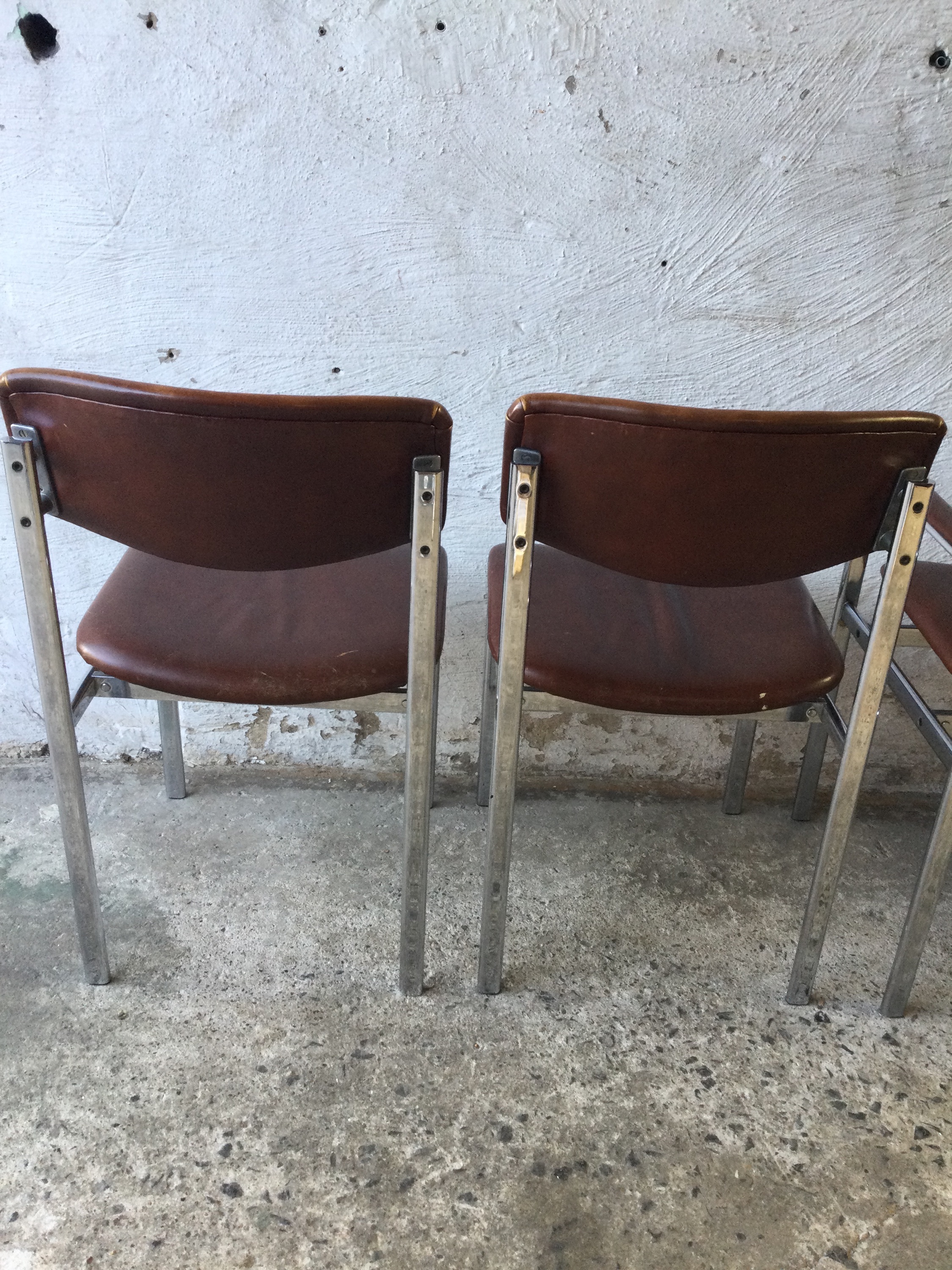 Set of four leather brown cognac chairs, two with armrests and two without armrests,