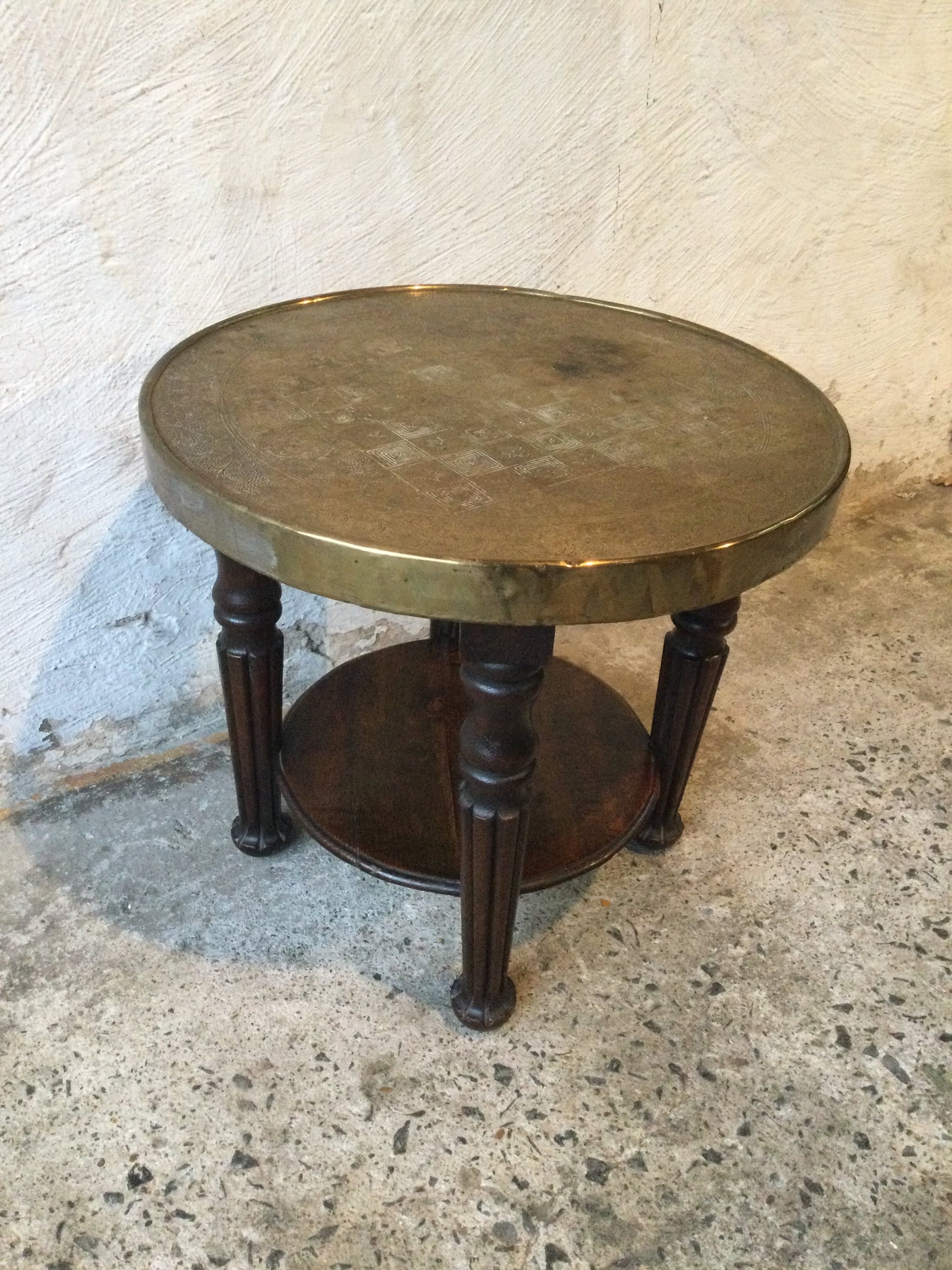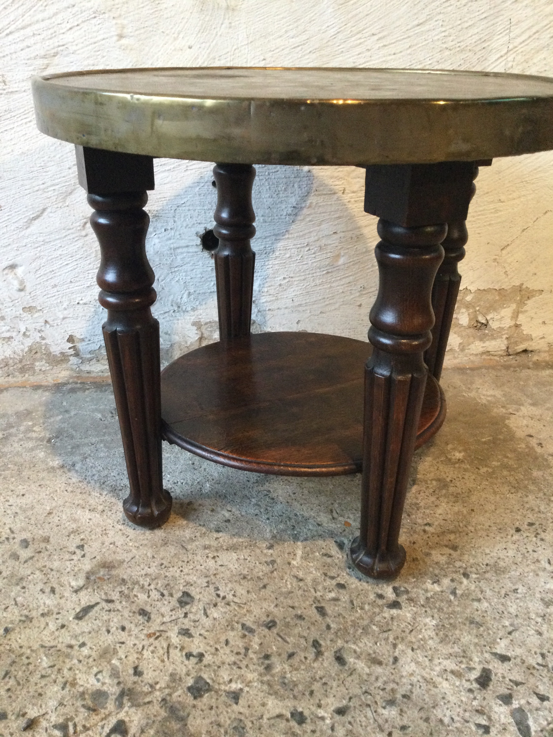 Side table for playing chess, with oak base and brass top.