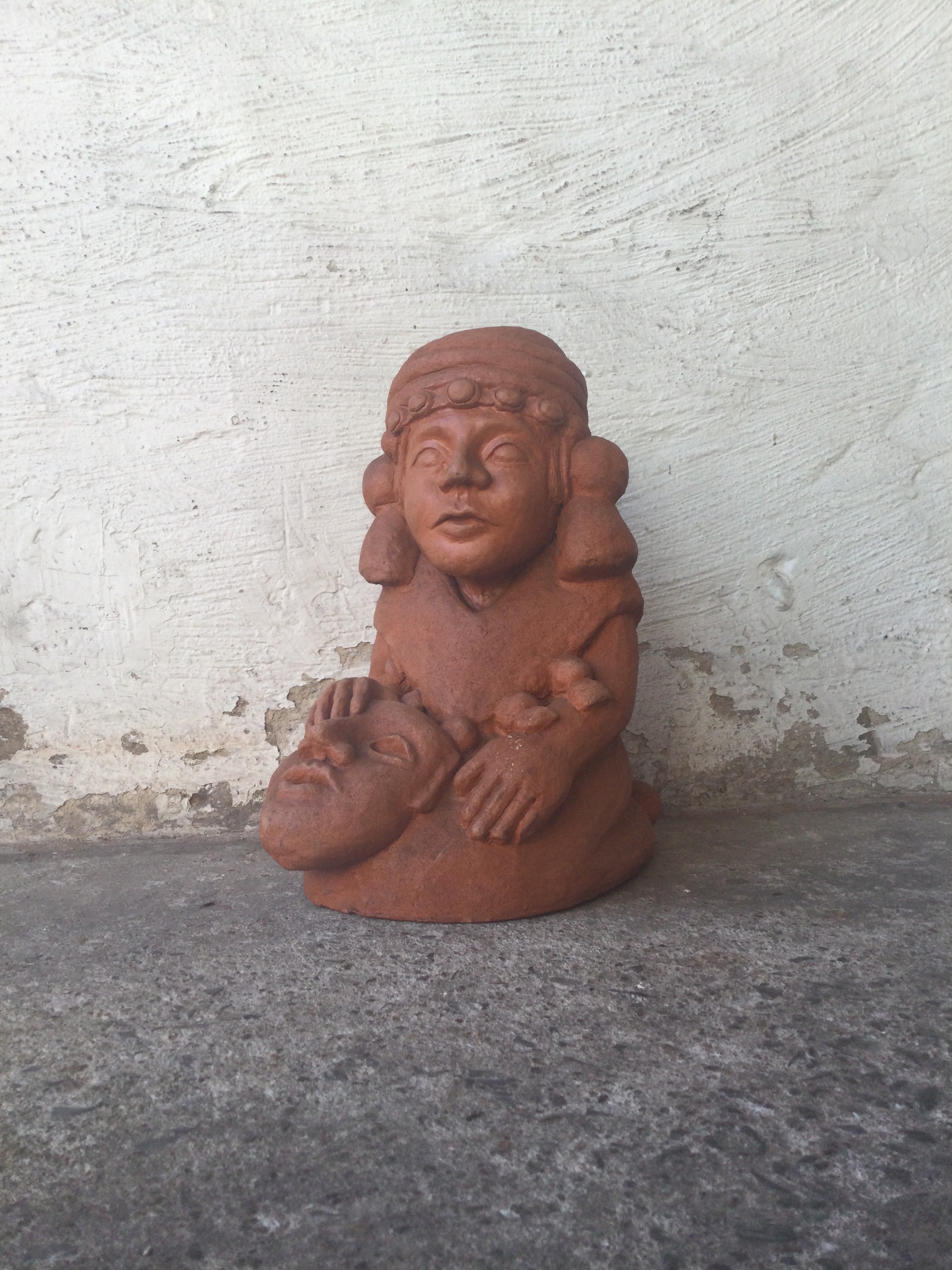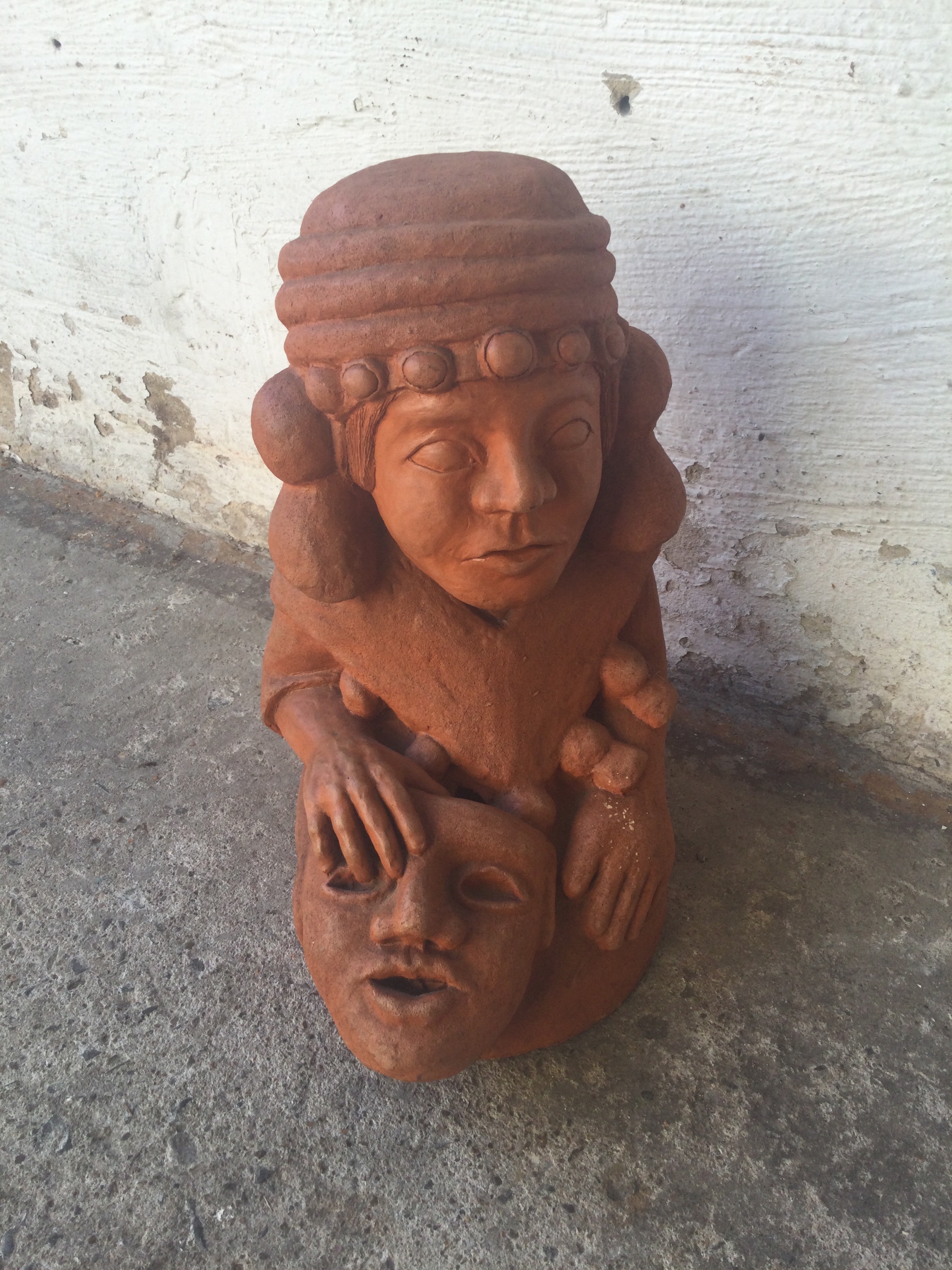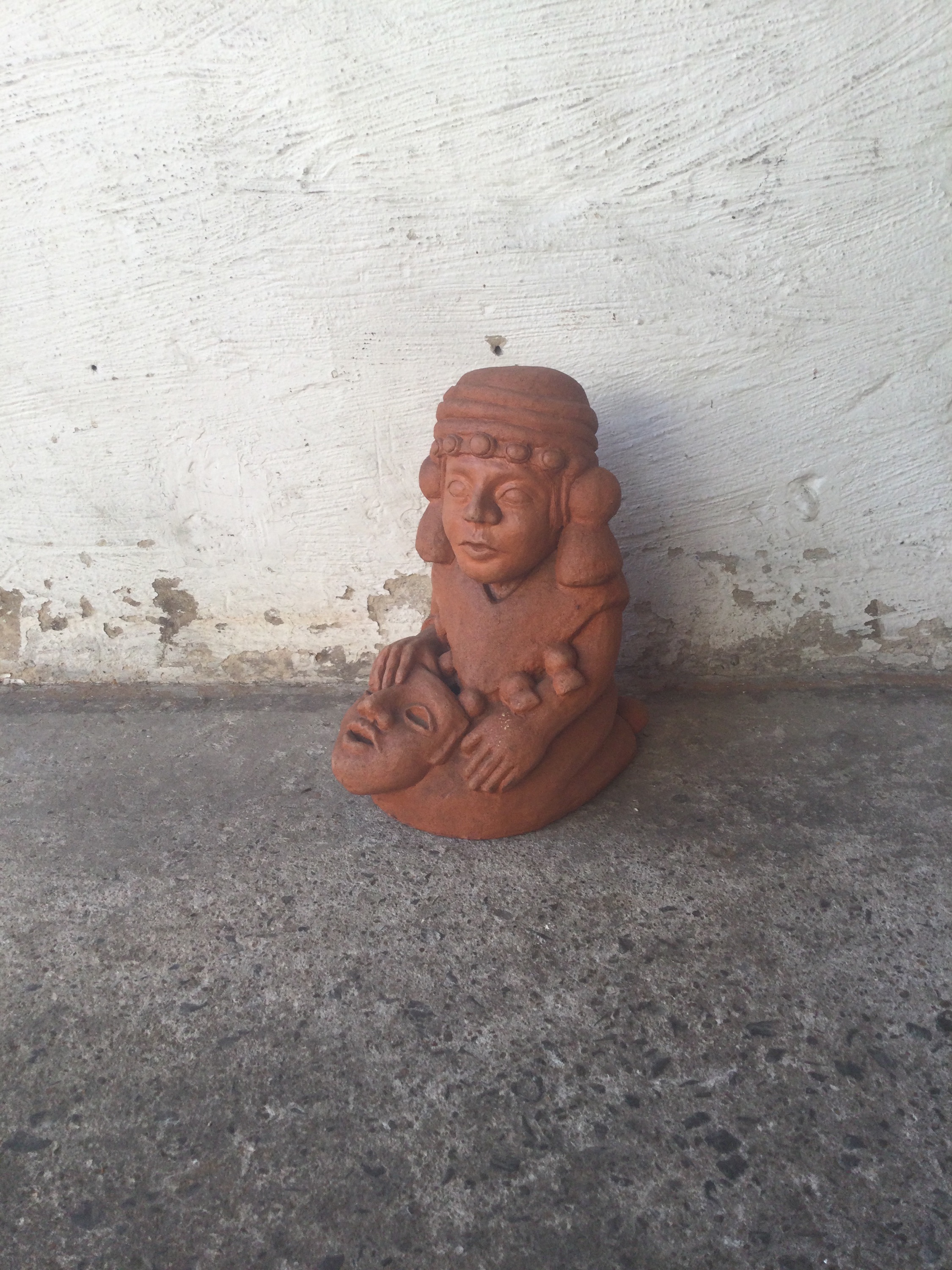 Terra cotta statue of a Inca with mask. The statue has a small hole in the middle as seen on the photos.