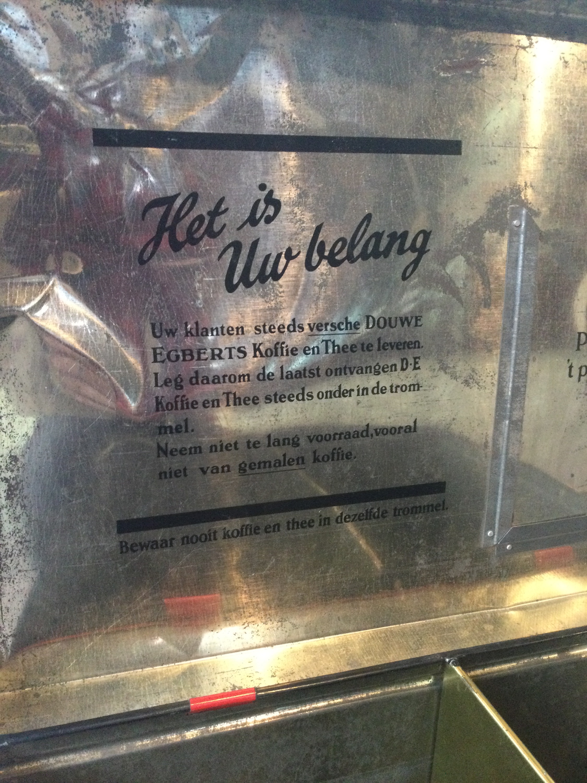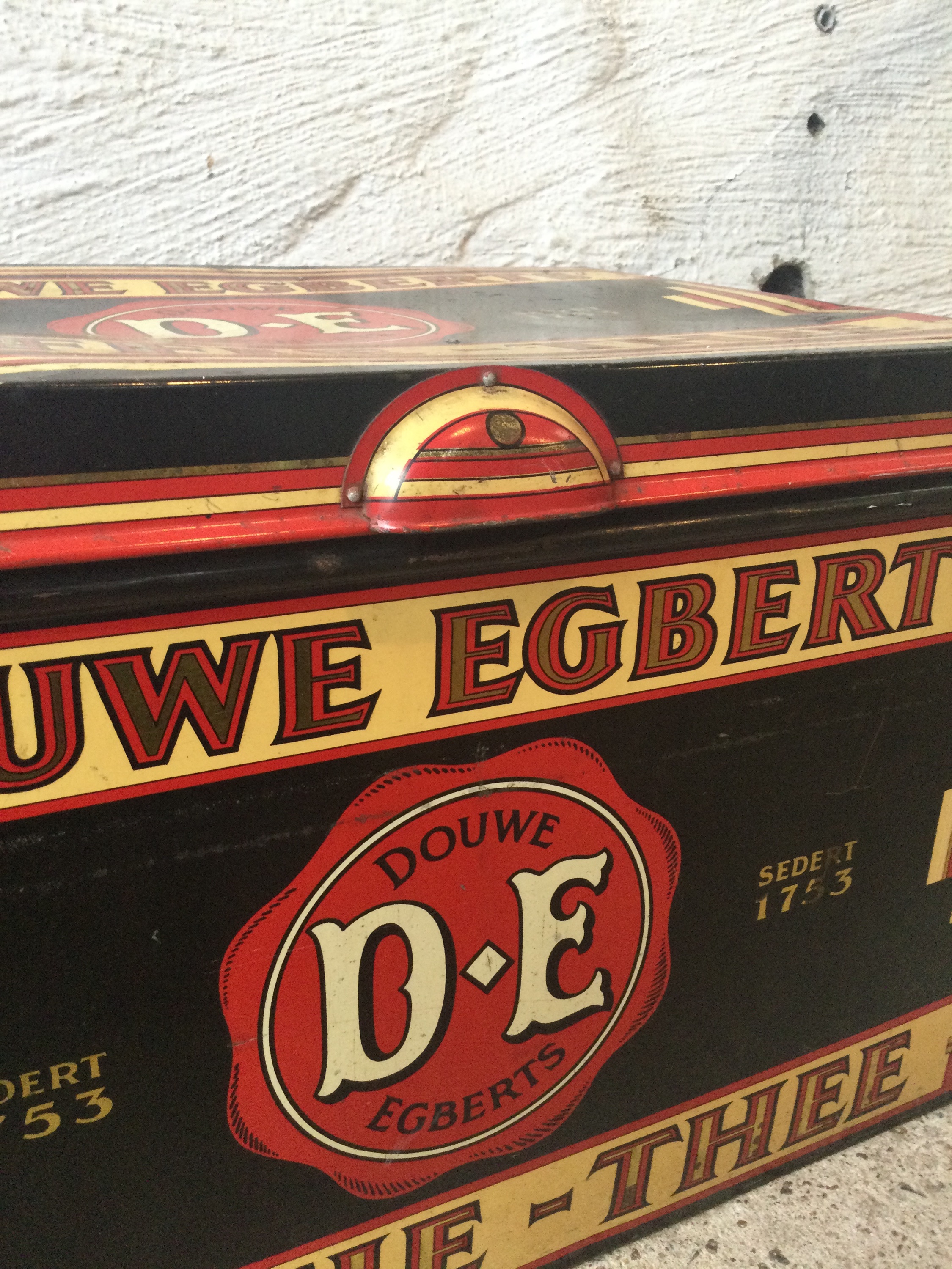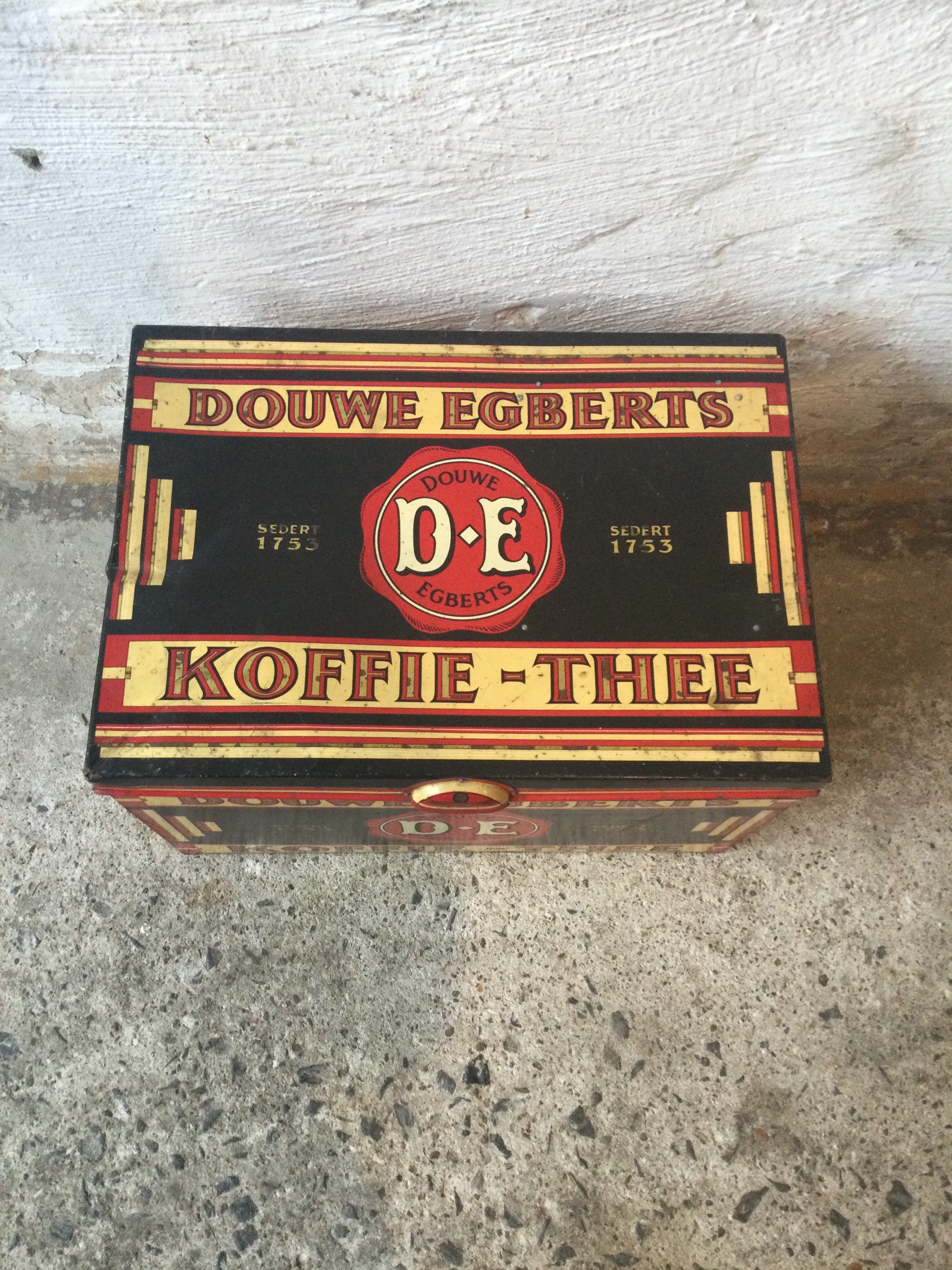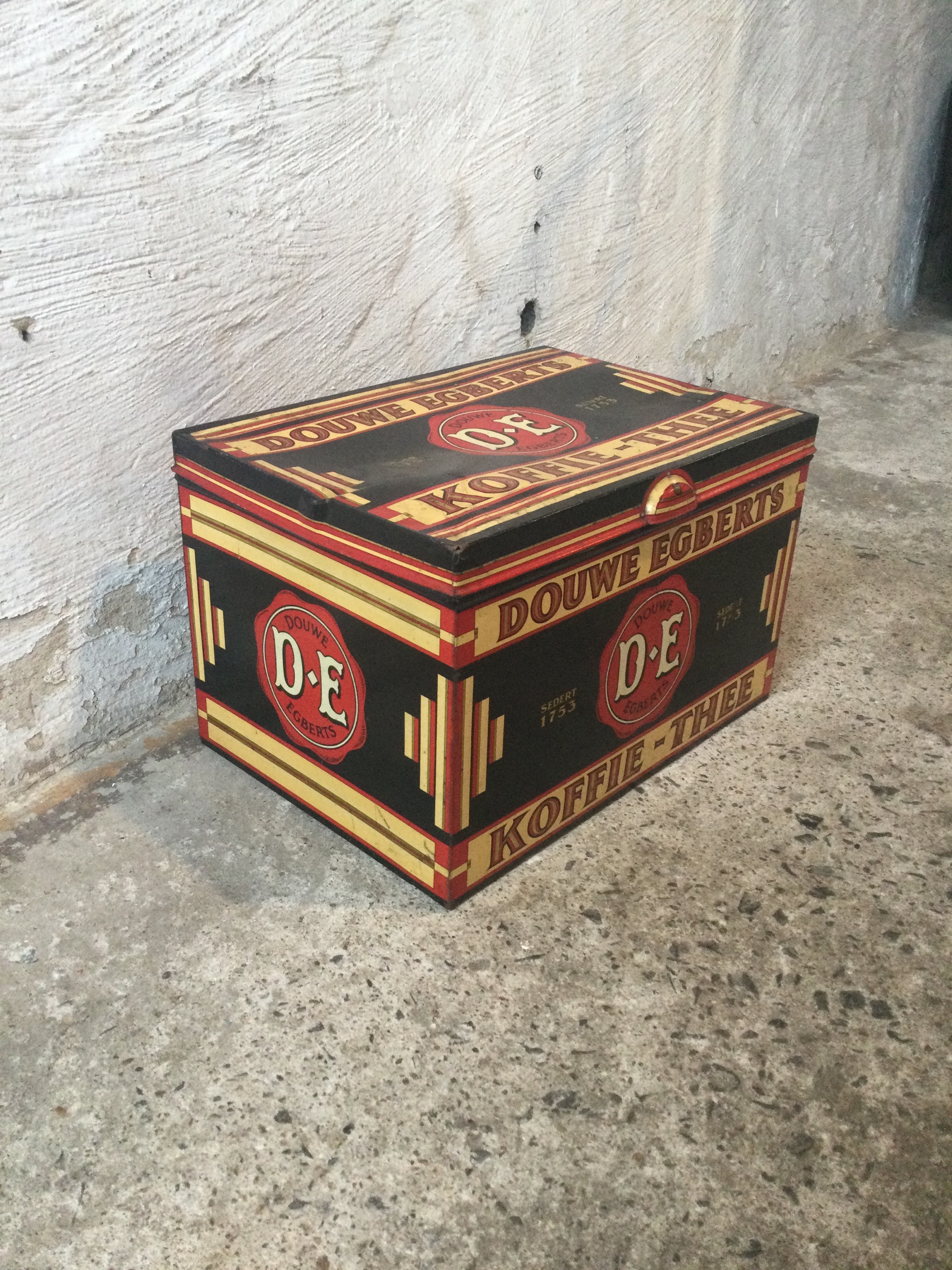 Tin box from the Dutch company Douwe Egberts Coffee-Tea. This box was used in the stores to sell their product. It has a hinged lid.