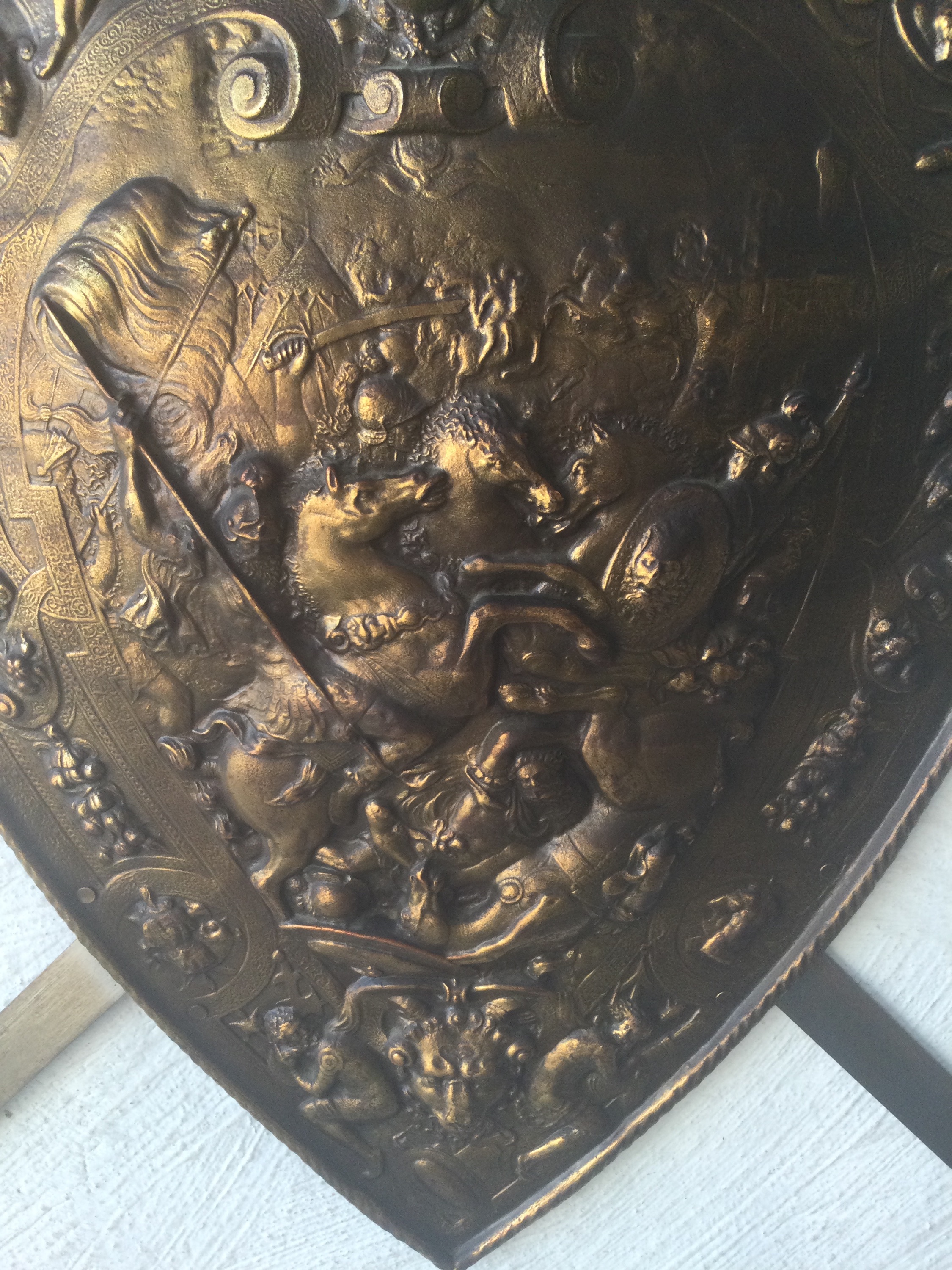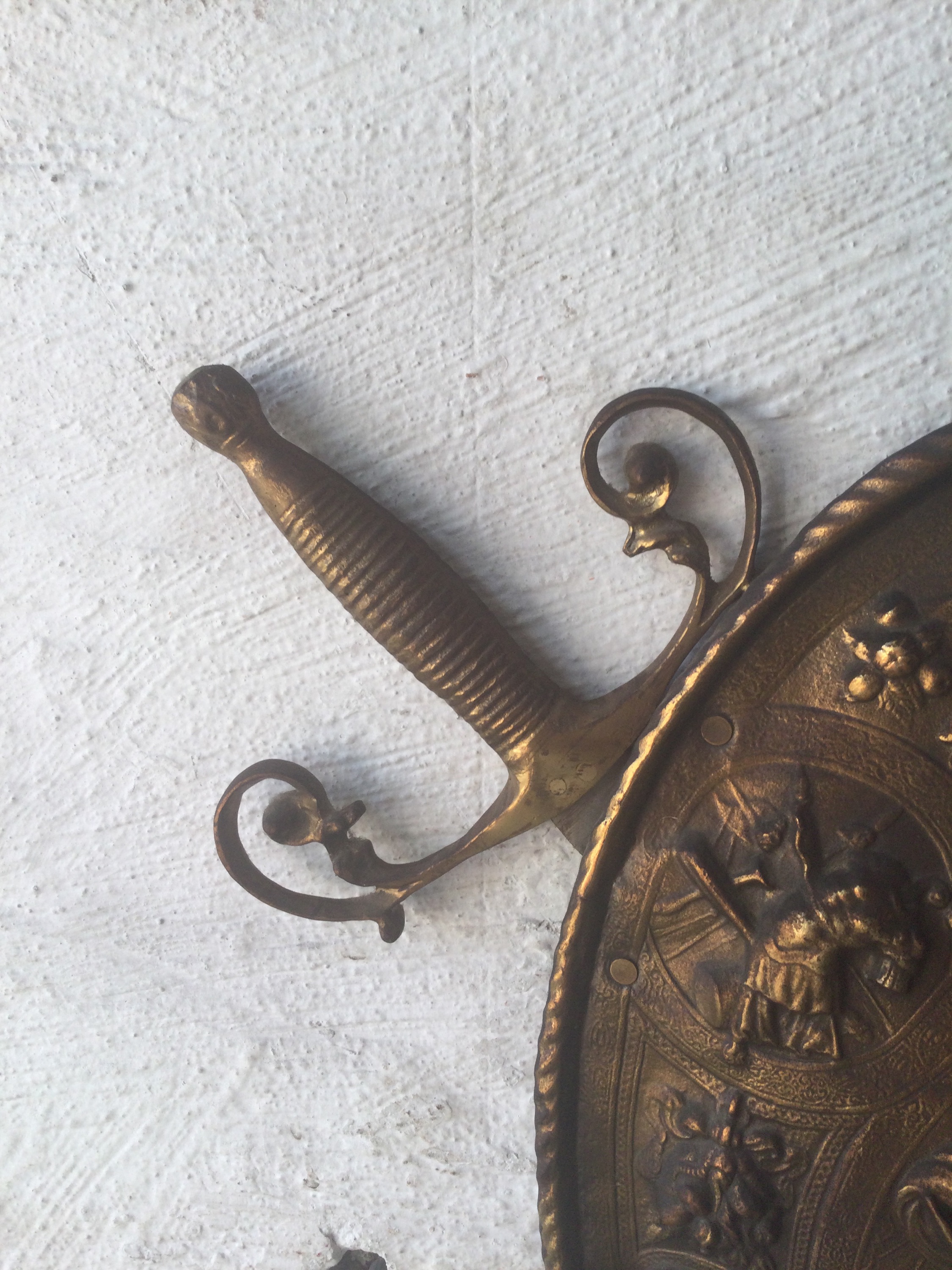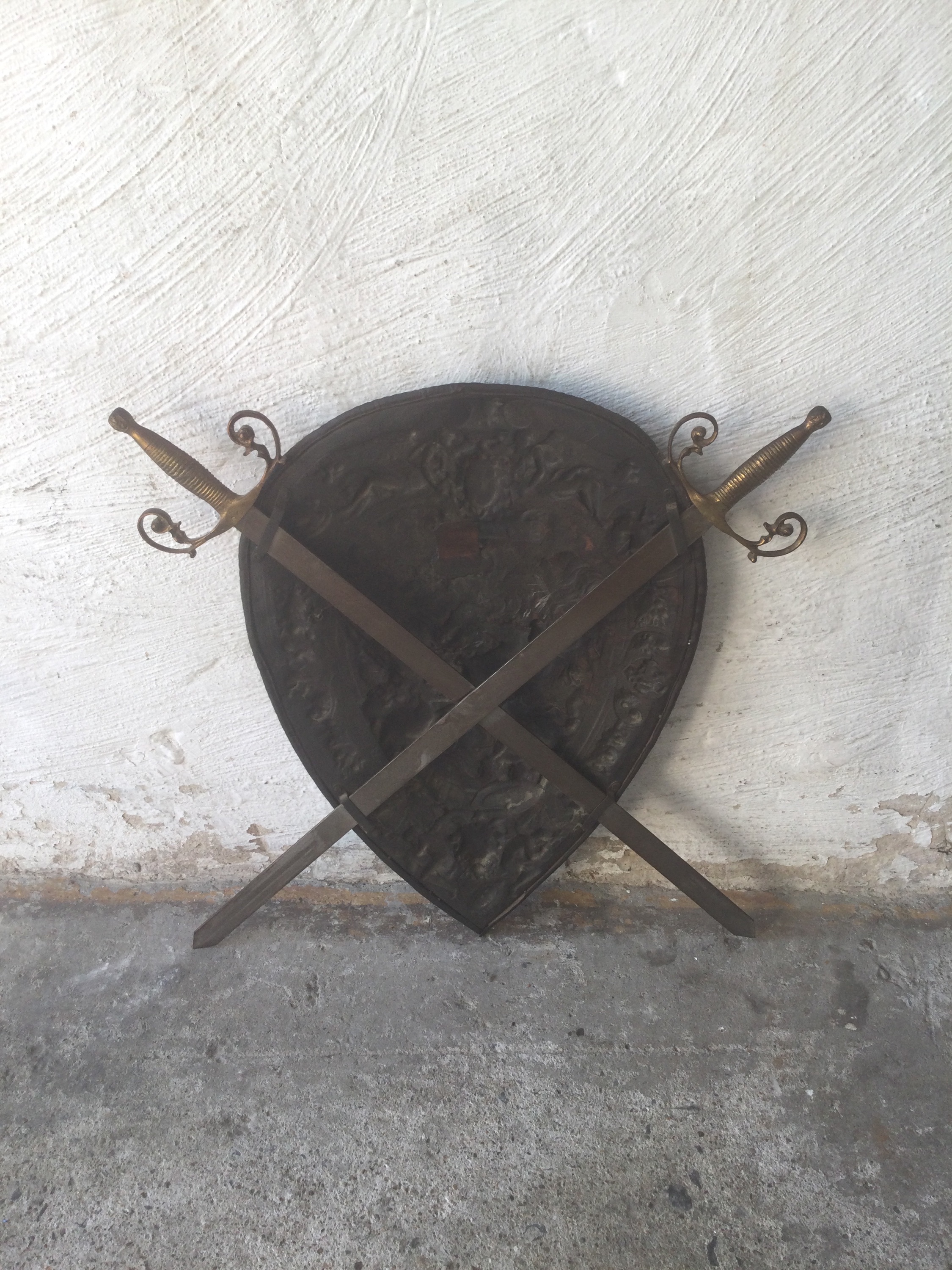 A French parade shield with swords that serves as a decorative piece for the wall. The shield is made of copper.