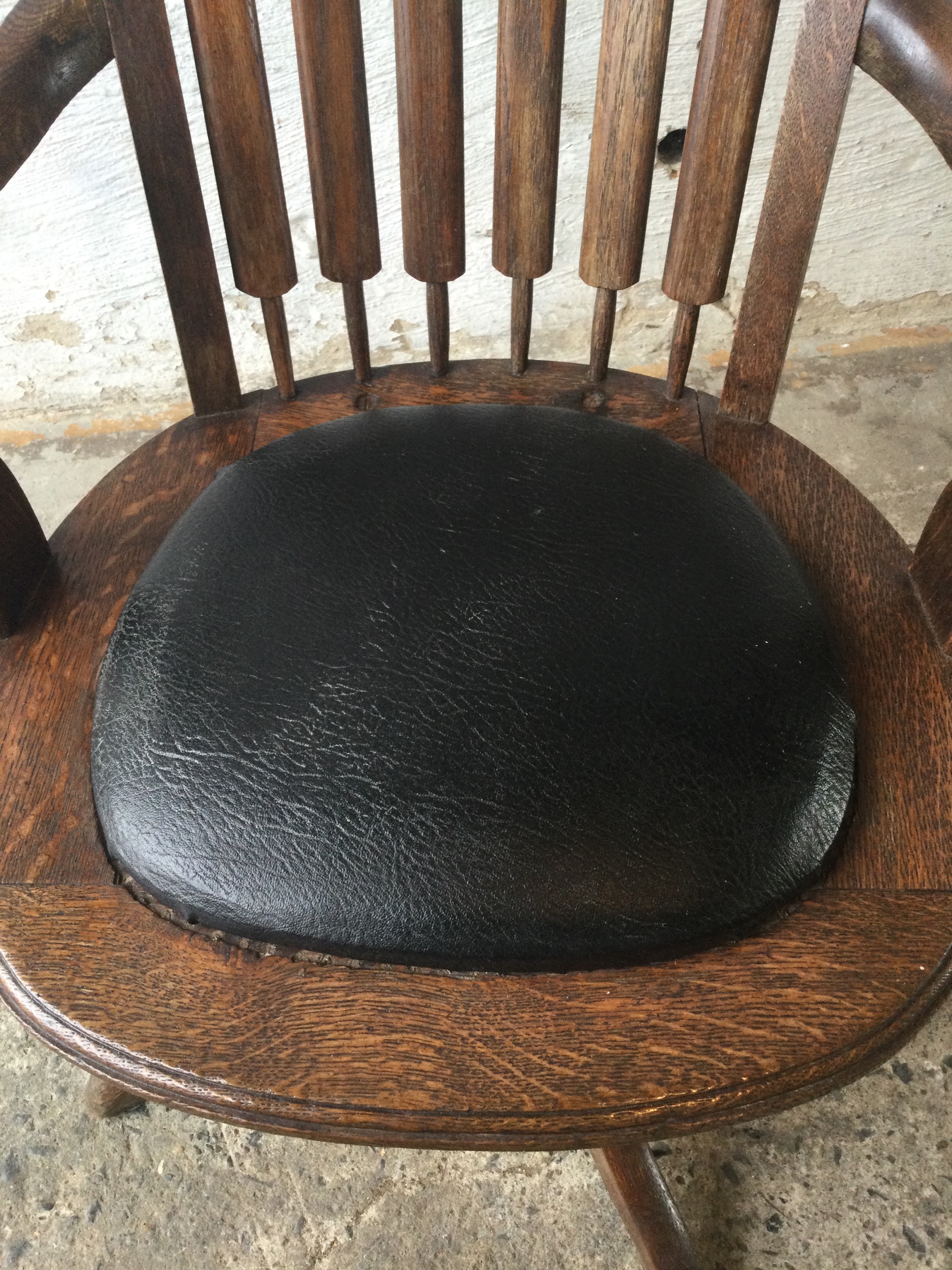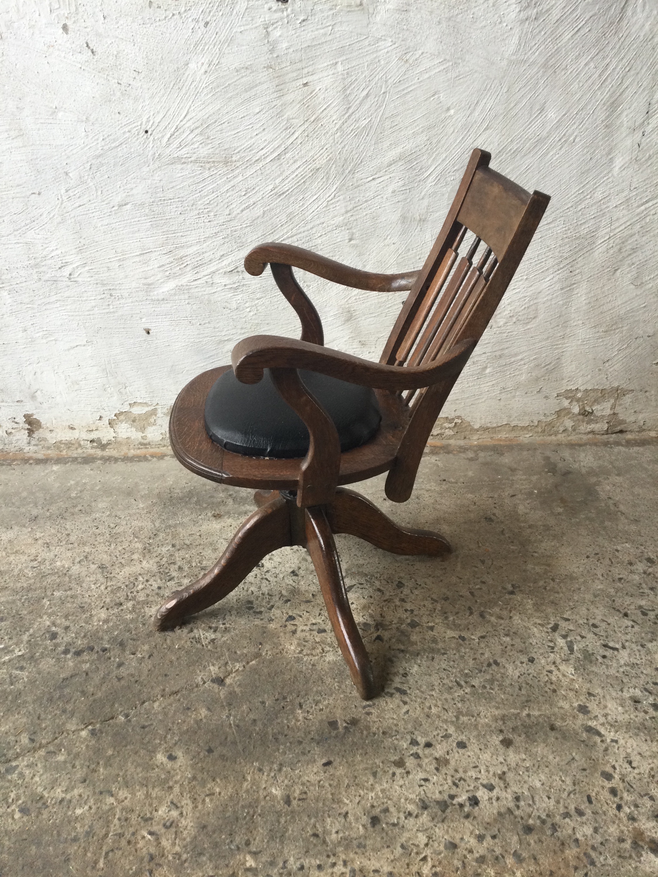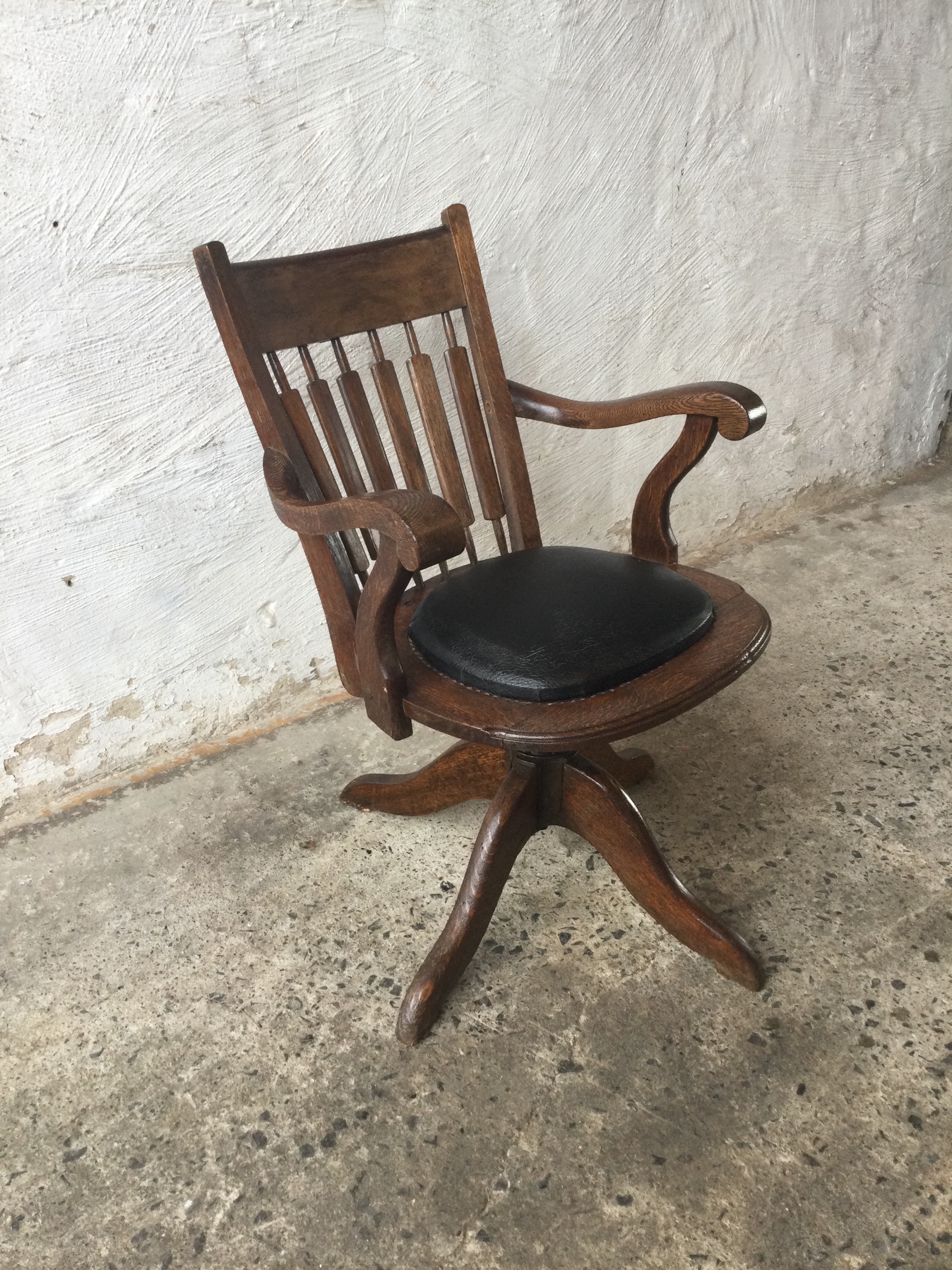 Desk chair in Oakwood with black leather seating, 360 turntable and in height adjustable.