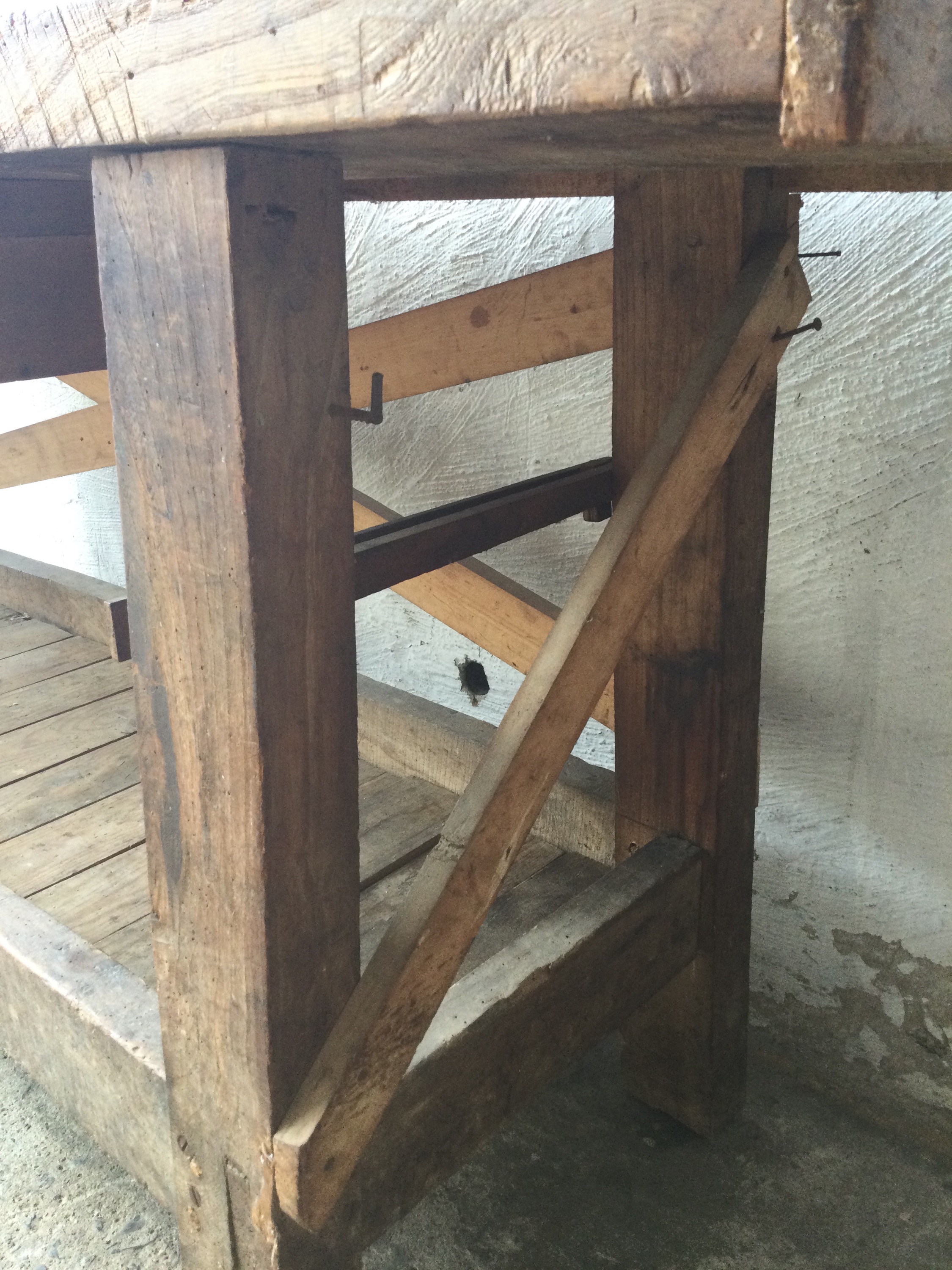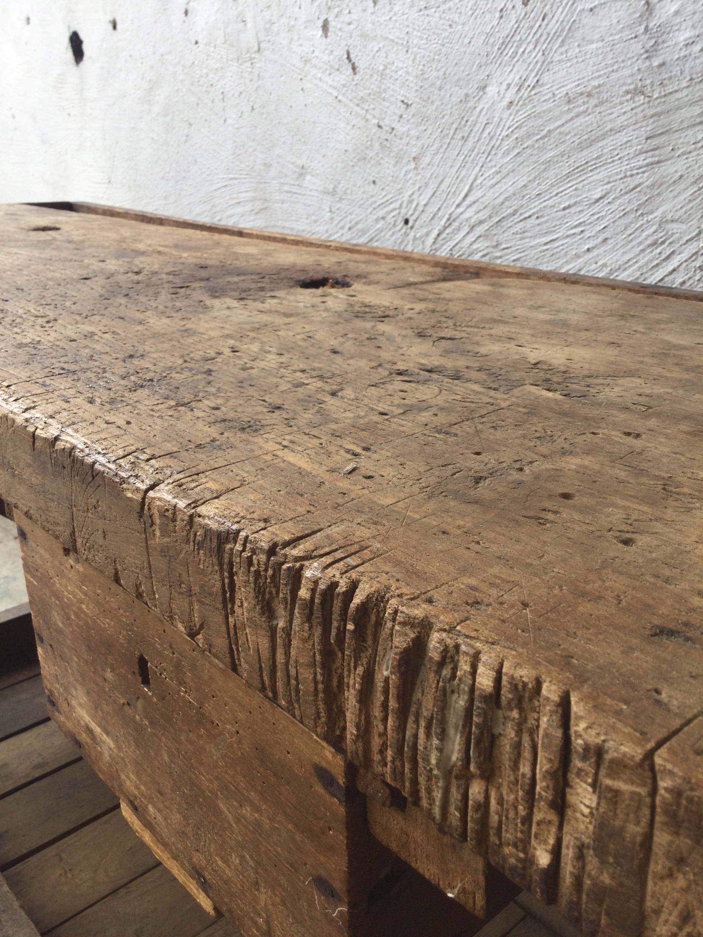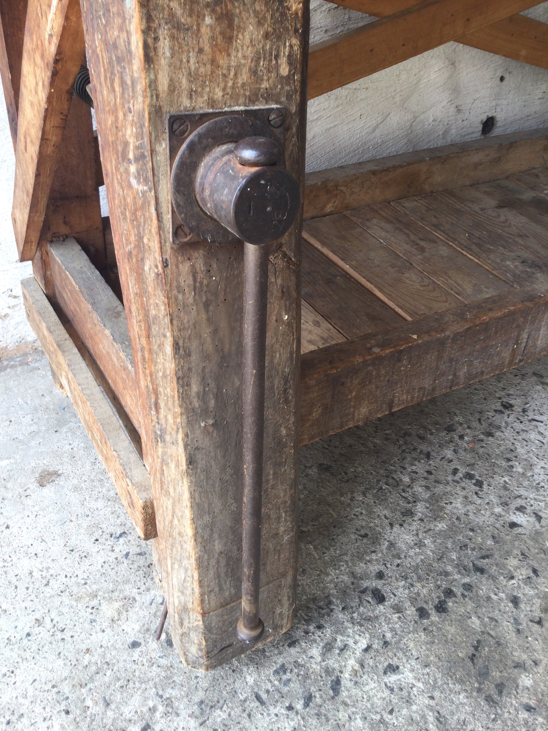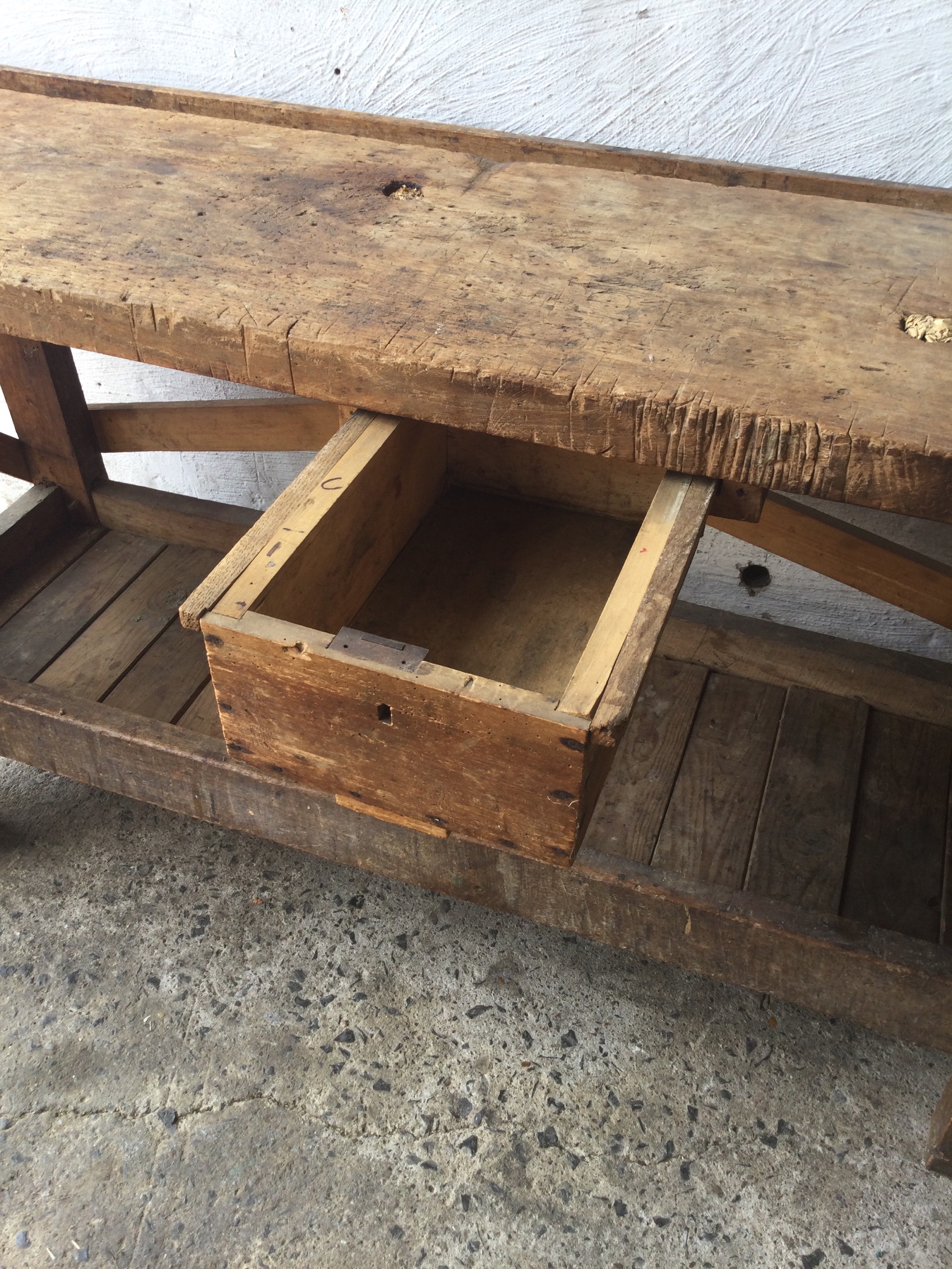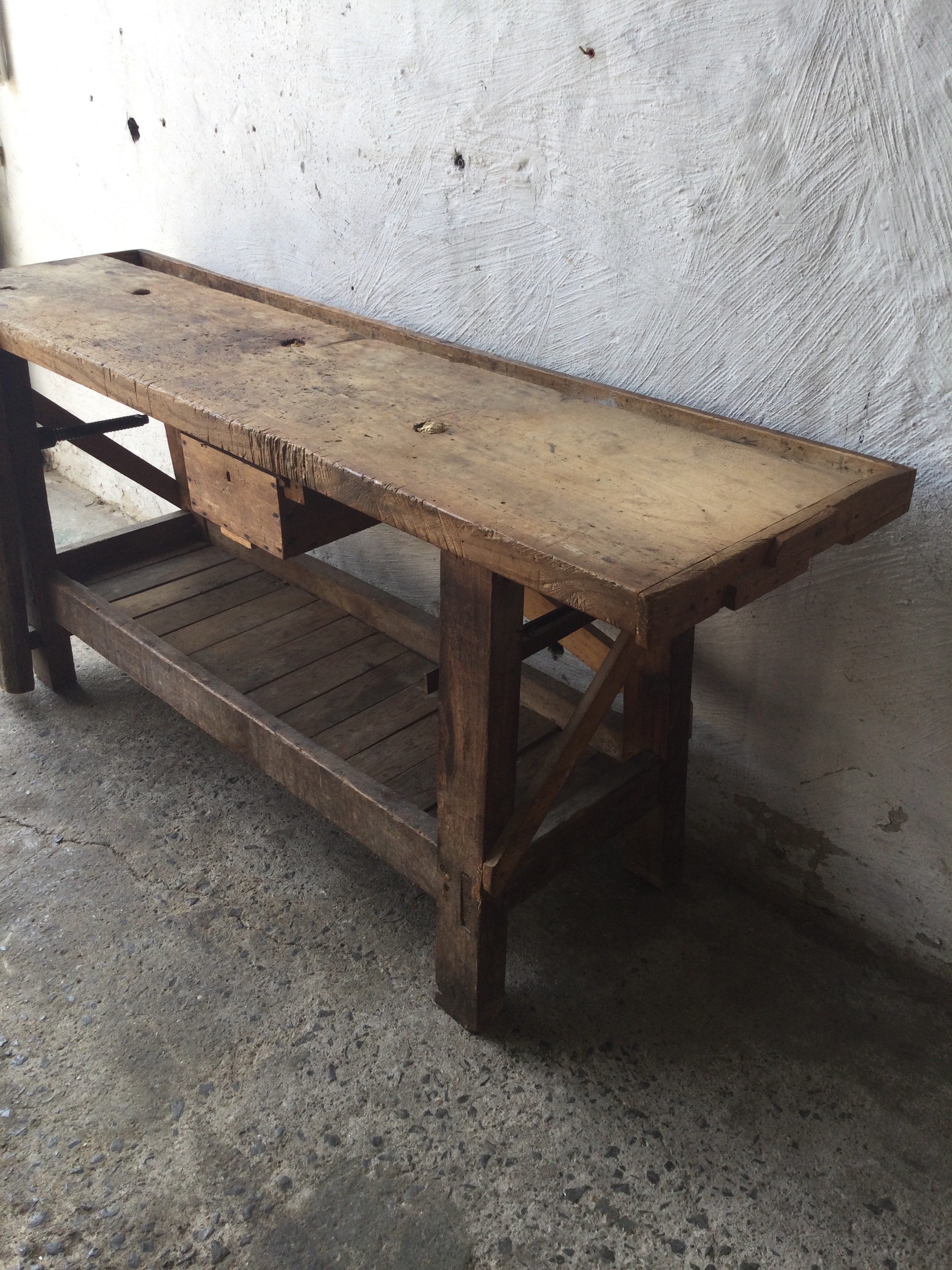 Wooden workbench with a beautiful patina top, one small drawer and a old vise.